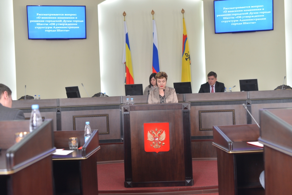 Четвёртый вопрос — «О внесении изменения в решение городской Думы города Шахты «Об утверждении структуры Администрации города Шахты», выступила начальник отдела муниципальной службы Администрации города Шахты И.В.Агалакова. В структуру администрации предложено внести должность ещё одного первого заместителя Главы Администрации. Данные изменения не потребуют дополнительных материальных средств. Изменения Думой одобрены.
