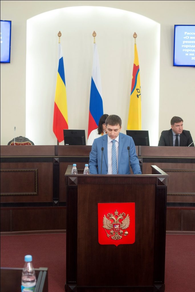 Первый вопрос — «О внесении изменений в решение городской Думы города Шахты «О бюджете города Шахты на 2015 и на плановый период 2016 и 2017 годов», выступил заместитель главы Администрации, директор департамента финансов Д.А.Дедученко. Изменения предложено внести в связи с принятием ряда федеральных приказов Министерства финансов РФ, областных законов, писем главных администраторов доходов, представлений главных распорядителей бюджетных средств. В результате изменений основные характеристики бюджета на 2015 год таковы: доходы — 4 437 381,4 тыс.рублей (+189 481,3 тыс.рублей), расходы — 4 638 985,8 тыс.рублей, дефицит — (-)201 604,4 тыс.рублей.