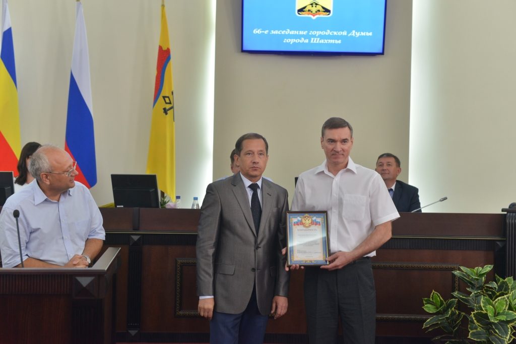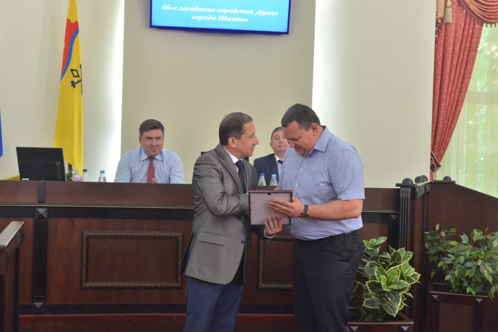 Двадцать третий вопрос — «О награждении Почетной грамотой городской Думы города Шахты Станиславова Дениса Ивановича», выступил Е.Н.Жадяев. Председателем городской Думы представлена кандидатура Станиславова Дениса Ивановича — Мэра города Шахты на награждение Почетной грамотой городской Думы города Шахты. На посту Мэра города Шахты Станиславов Денис Иванович уделяет первоочередное значение вопросам развития социальной сферы, инвестиционной политики, финансово-экономическому оздоровлению территории, безопасности жителей города. За время его руководства обеспечено дополнительное поступление в местный бюджет налоговых и неналоговых доходов, снижена недоимка в консолидированные бюджеты области и города Шахты. Обновлена нормативно-правовая база деятельности органа местного самоуправления по всем ключевым направлениям. Разработан ряд программ, направленных на развитие жилищно-коммунального комплекса, благоустройства, транспортного обслуживания и других сфер эффективного управления городом.