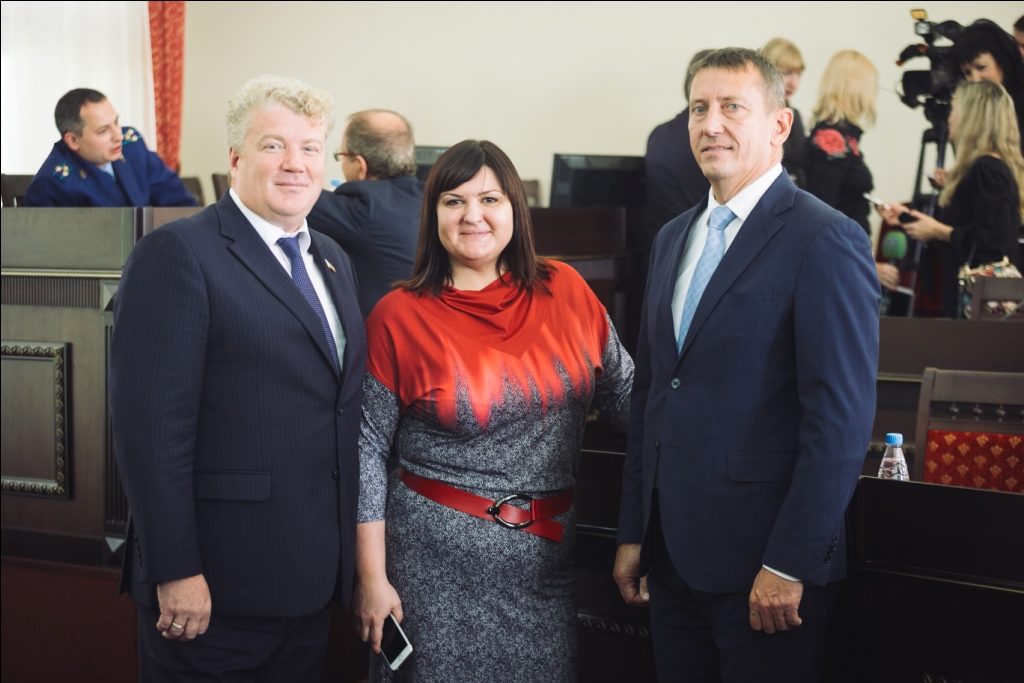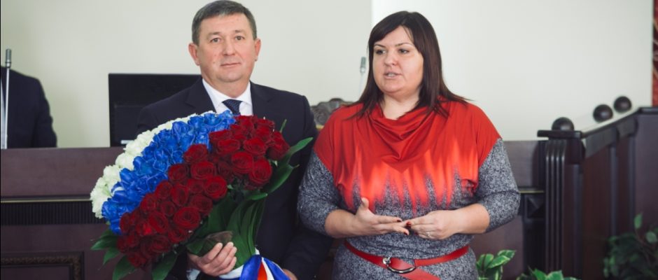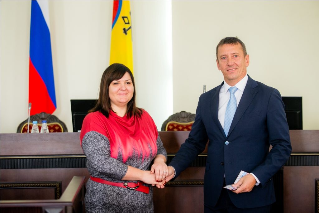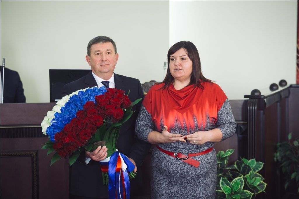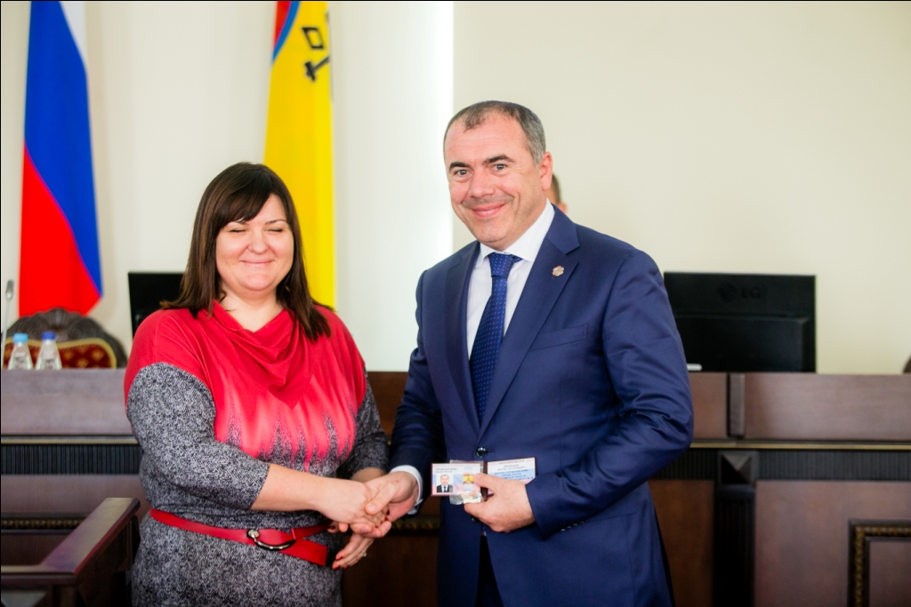 Заседание началось с торжественной процедуры вручения председателем Думы — главой города Ириной Жуковой удостоверений и нагрудных знаков вновь избранным депутатам городской Думы города Шахты 6-го созыва.