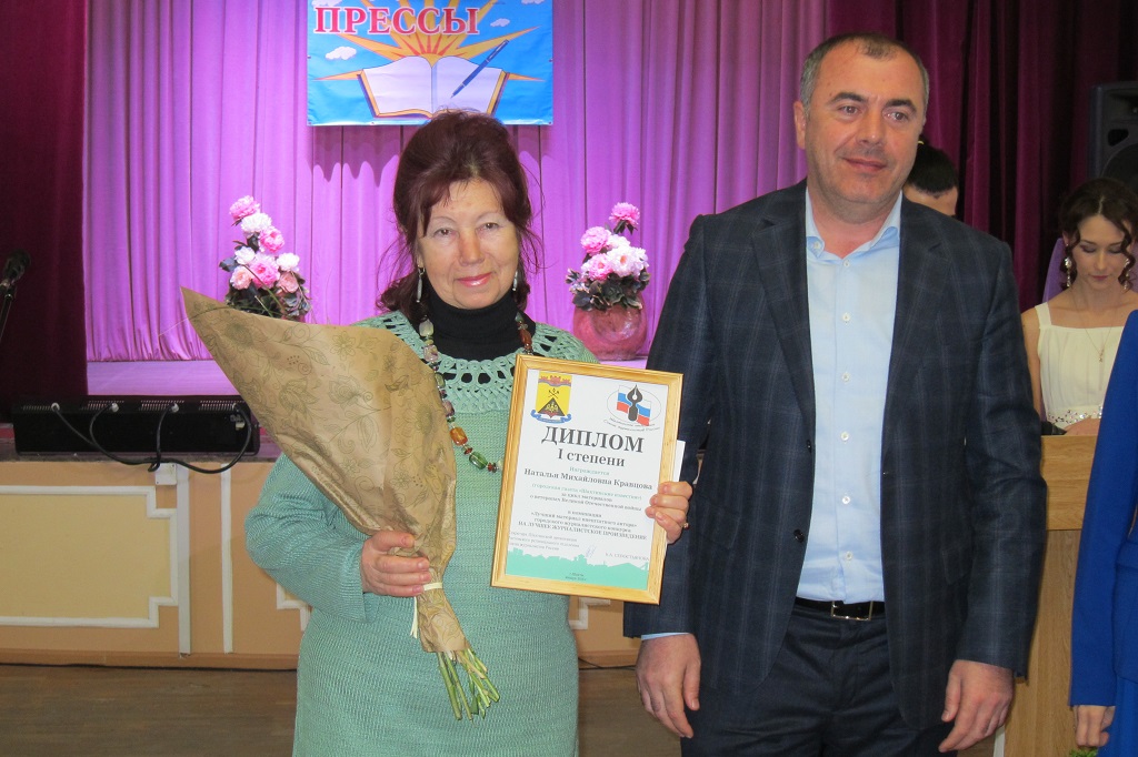 Депутат городской Думы Тенгиз Хиникадзе вручил дипломы и призы победителям в номинации «Лучший материал внештатного автора»: 3 место — Сергей Алексеевич Новиков (газета «Шахтинские известия» за публикацию «Когда и кем основан город Шахты, или Былое и небылицы нашего города»), 2 место — Владимир Захарович Ковальчук (газета «Шахтинские известия») за публикацию «Что ты знаешь о солнце»), 1 место — Наталья Михайловна Кравцова (газета «Шахтинские известия» за цикл материалов о ветеранах Великой Отечественной войны).