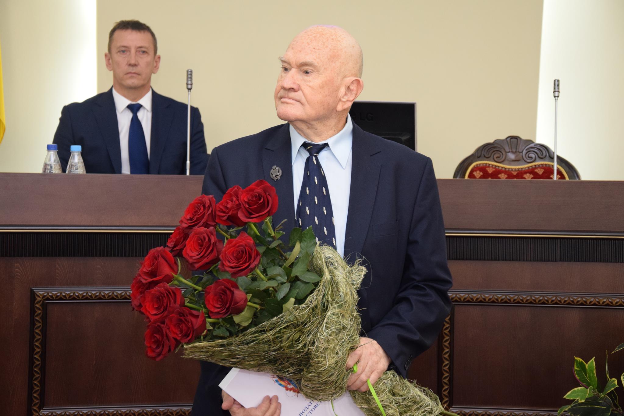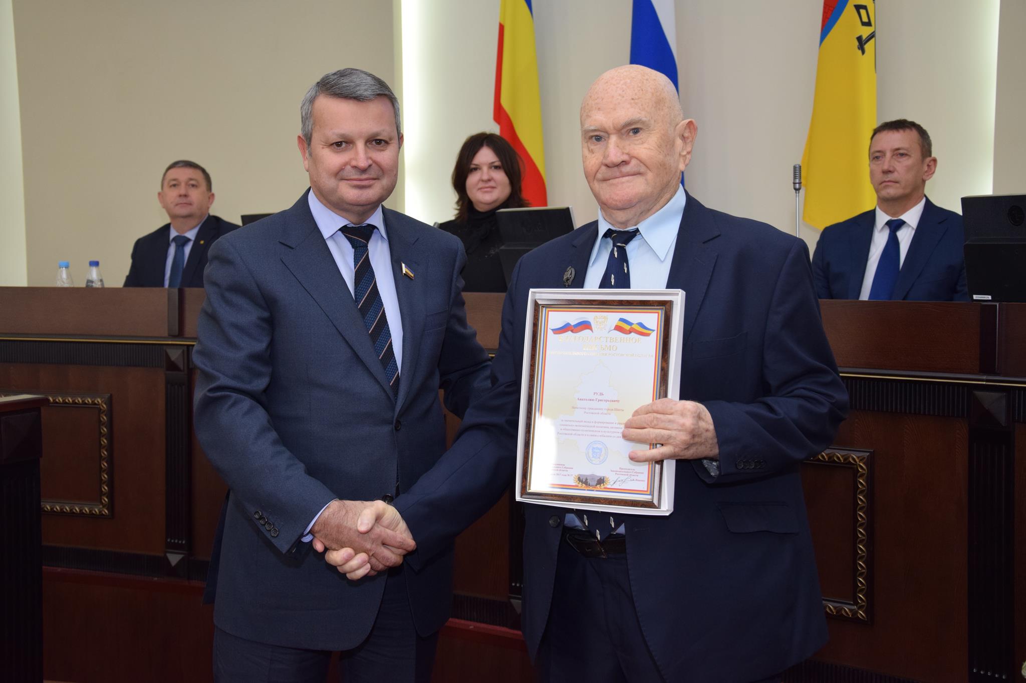 Вначале работы заседания депутат Законодательного Собрания Ростовской области Игорь Шинкарь выполнил приятную миссию: вручил Благодарственное письмо ЗС РО Почётному гражданину города Шахты Анатолию Григорьевичу Рудю, отметившему недавно 80-летний юбилей!