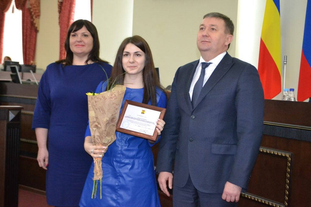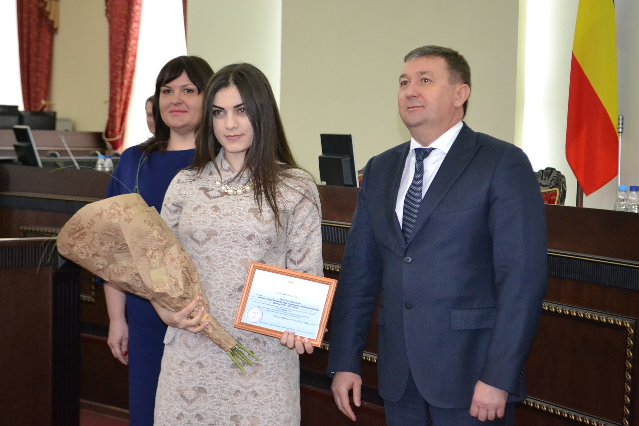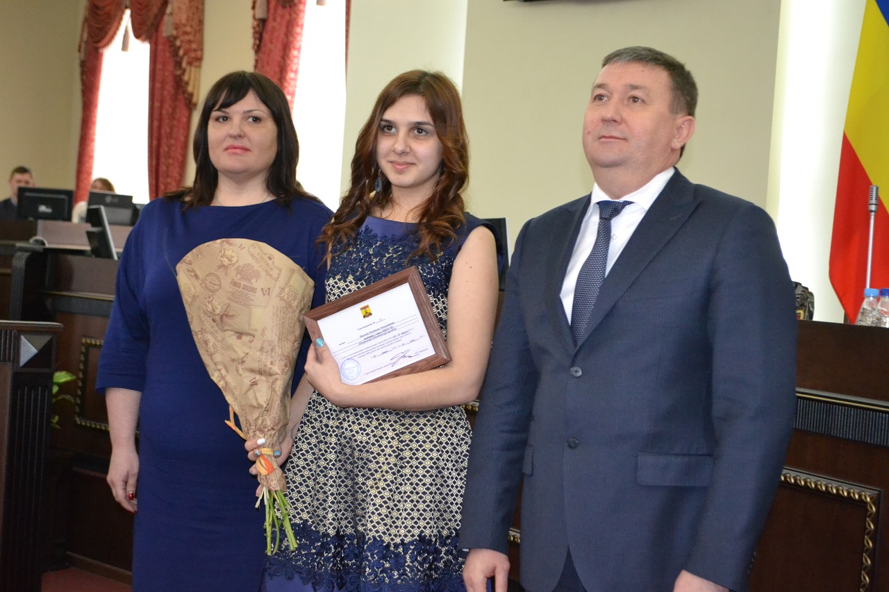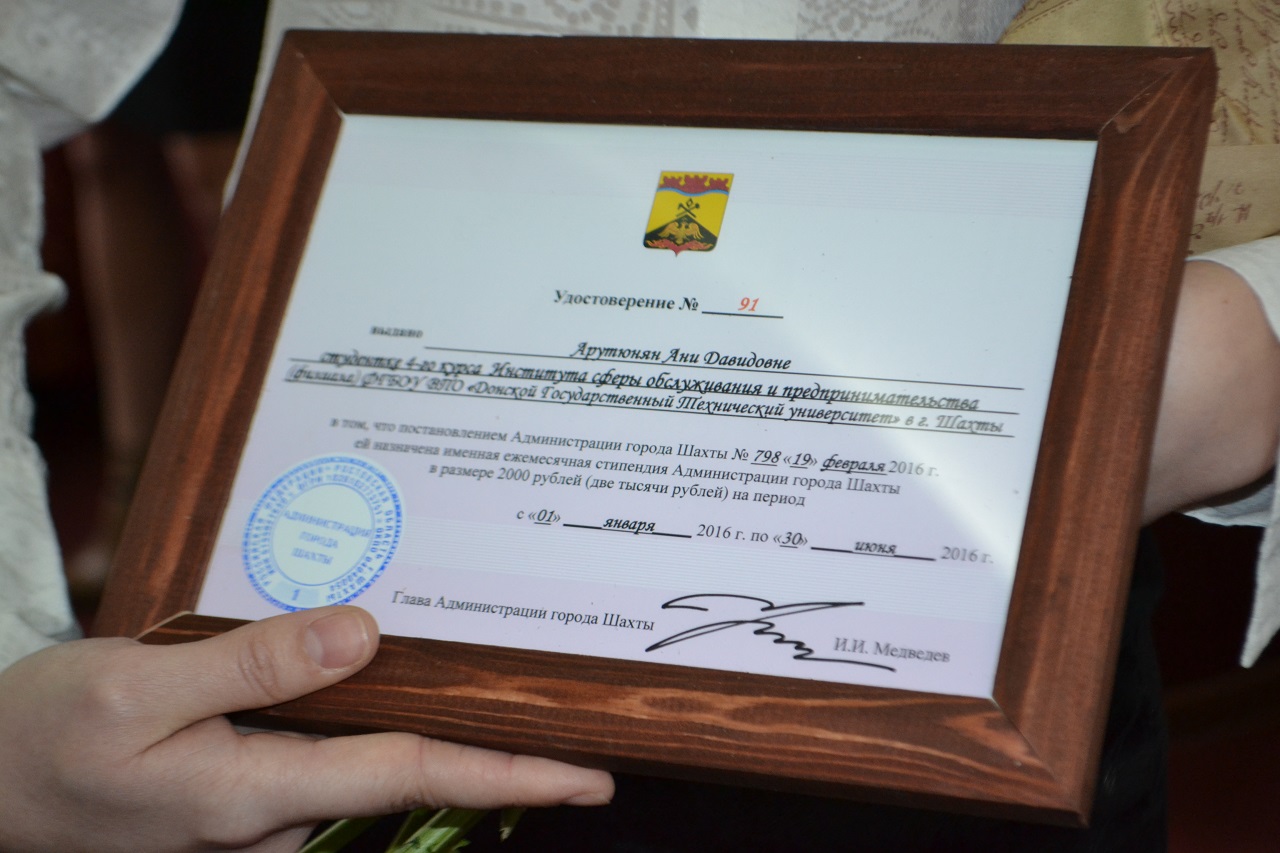 Заседание началось с торжественной процедуры вручения удостоверений о назначении именных стипендий Думы и Администрации студентам ВУЗов и СУЗов города Шахты по итогам зимней экзаменационной сессии 2015-2016 учебного года. Церемонию награждения провели председатель городской Думы — глава города Шахты Ирина Жукова и глава Администрации Игорь Медведев.
