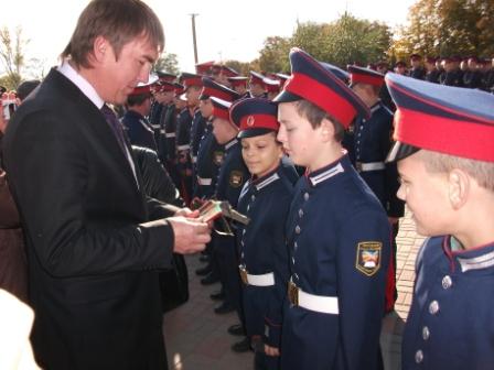 Василий Витальевич поздравил ребят с посвящением, и вручил вновь поступившим погоны, закрепив это твердым рукопожатием.