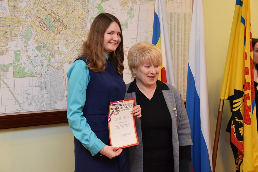 Махиня Наталья Юрьевна, руководитель творческого объединения «Свой голос» Городского Дома детского творчества, за вклад в развитие юнкоровского движения, создание и выпуск детской газеты «ШАНС» и высокие показатели в областном конкурсе «Юный журналист Дона».