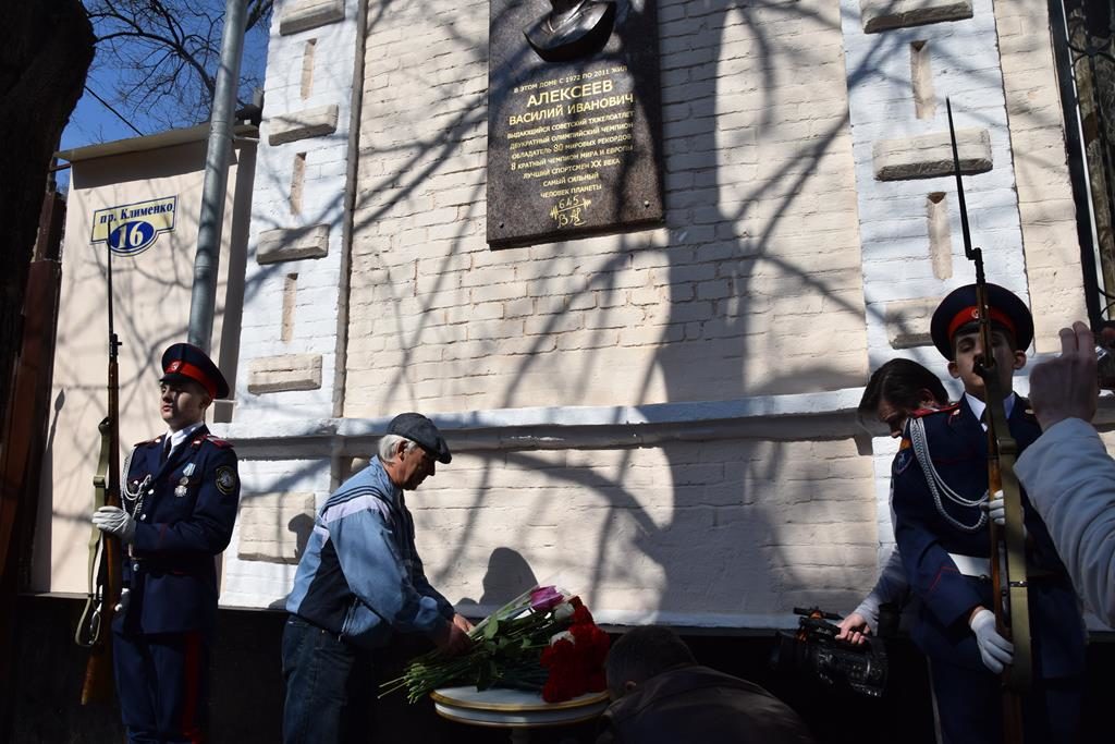 На 32-м заседании городской Думы города Шахты депутаты приняли решение о размещении памятной доски на доме по проспекту Клименко, где жил В.И.Алексеев. И вот в яркий весенний день состоялась торжественная церемония открытия памятной доски. Почтить память великого спортсмена и высказать слова благодарности его супруге Олимпиаде Ивановне, сыну пришли председатель городской Думы — глава города Шахты Ирина Жукова, председатель комитета по молодёжной политике Законодательного Собрания РО Екатерина Стенякина, и.о.главы Администрации города Анатолий Глушков, председатель городской Думы — глава города Гуково Борис Трофимов, депутаты городской Думы, представители спортивного сообщества, кадеты и ещё много горожан.