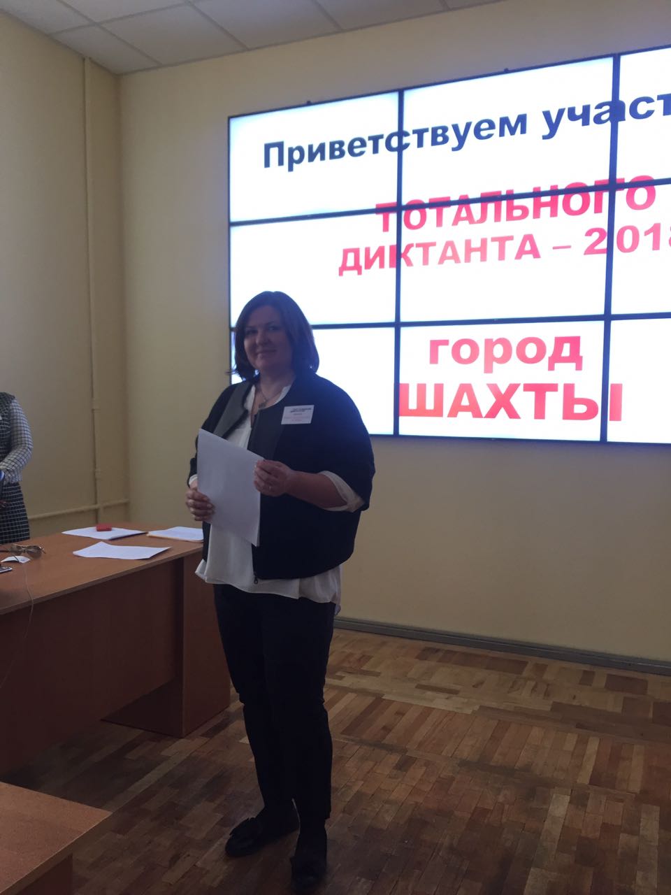 Председатель городской Думы — глава города Шахты Ирина Жукова на главной площадке, расположенной в стенах Шахтинского института (филиал) ЮРГПУ(НПИ) им. М.И. Платова, читала вслух диктант, автором которого в этом году стала Гузель Яхина, автор романа «Зулейха открывает глаза», лауреат премий «Большая книга», «Ясная Поляна» и «Книга года».