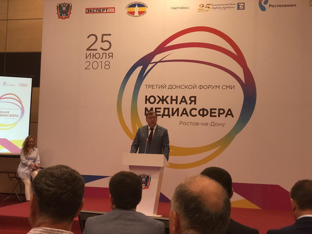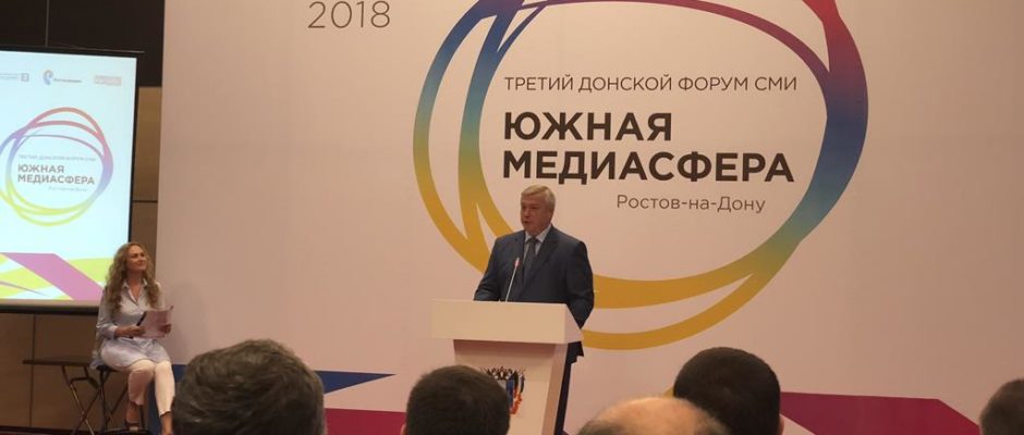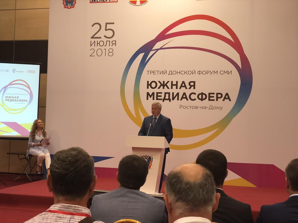 С приветственным словом к участникам форума обратился Губернатор Ростовской области В.Ю.Голубев. Он сказал, что ежедневно знакомится с новостями в СМИ, а в дни чемпионата мира по футболу следил за информацией утром и вечером! Василий Юрьевич рассказал о том, как ведётся работа над Стратегией развития — 2030, об активной роли прессы в освещении этой важной для всех жителей региона темы. Отдельное внимание Губернатор уделил предстоящим выборам в Законодательное Собрание РО, которые пройдут в сентябре текущего года: «Ваша миссия — беспристрастно и конкретно осветить выборный процесс, объективно рассказать о людях, которые намерены представлять интересы жителей области в Донском парламенте. Пусть люди выберут достойных.»