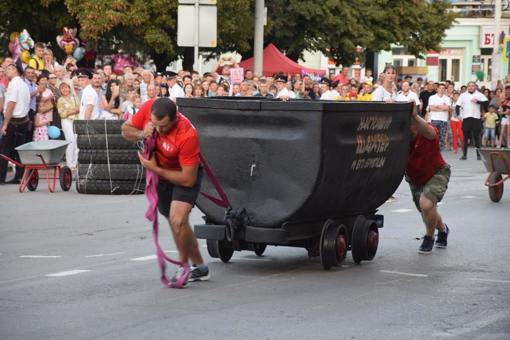 А после шествия начались состязания «Шахтёр и его бригада», в этом году организаторы усилили накал борьбы и пригласили к участию силачей из соседних городов Новошахнинск, Белая Калитва, Гуково, Зверево. Гости привезли с собой видео-презентации городов для показа на большом экране, а также — надежду на победу. Формат самих состязаний не изменился, участники показывали умения и навыки шахтёров — пролезали через рукав-лаву, работали обушком, катали тачки и всей командой на заключительном этапе тащили тяжёлую вагонетку к финишу. Ведущие подбадривали участников и просили «дать шума». В упорной борьбе победу одержали… шахтинцы! Но все почему-то с самого начала в это верили, потому как зрители очень бы расстроились, если бы команда-хозяин не оправдала надежд. И у наших парней выбора иного не было, как побеждать. На втором месте команда из Зверево, на третьем — из Новошахтинска.