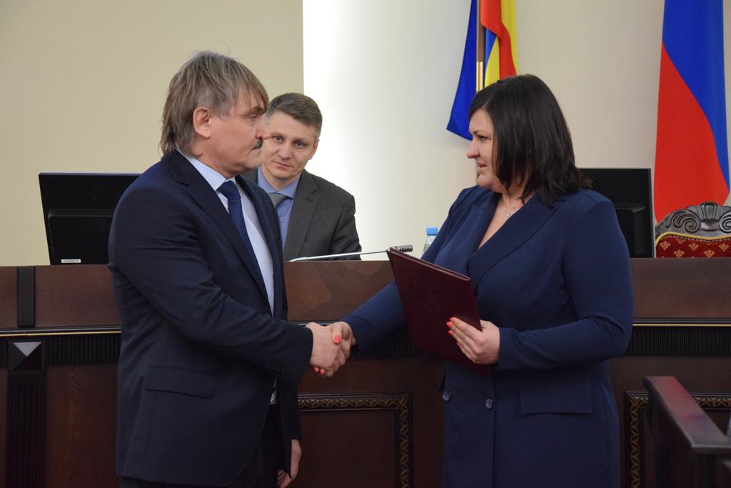 Перед рассмотрением основной повестки дня Председатель городской Думы – глава города Шахты Ирина Жукова вручила Почетную грамоту городской Думы Андрею Горцевскому за активную деятельность в рамках исполнения полномочий депутата избирательного округа №25, оказание спонсорской и организационной помощи в проведении ремонта социальных объектов на территории округа.
