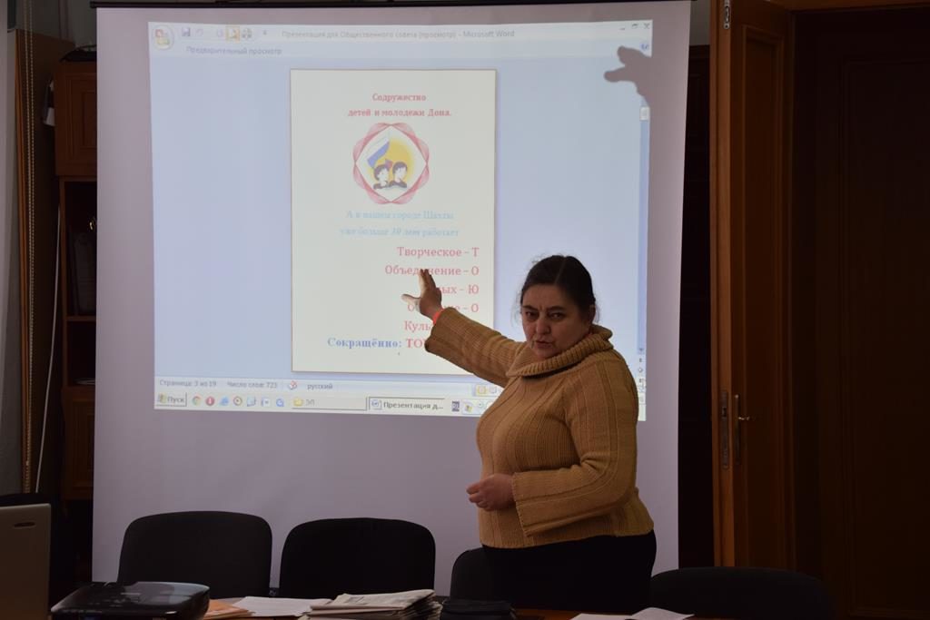 Затем члены Совета Общественной палаты заслушали Высоцкую Э.Л. по вопросу о деятельности территориального Отделения Ростовской Региональной Детско-Молодёжной Общественной Организации «Содружество людей и молодёжи Дона» Творческое Объединение Юных «Освоение Культуры».