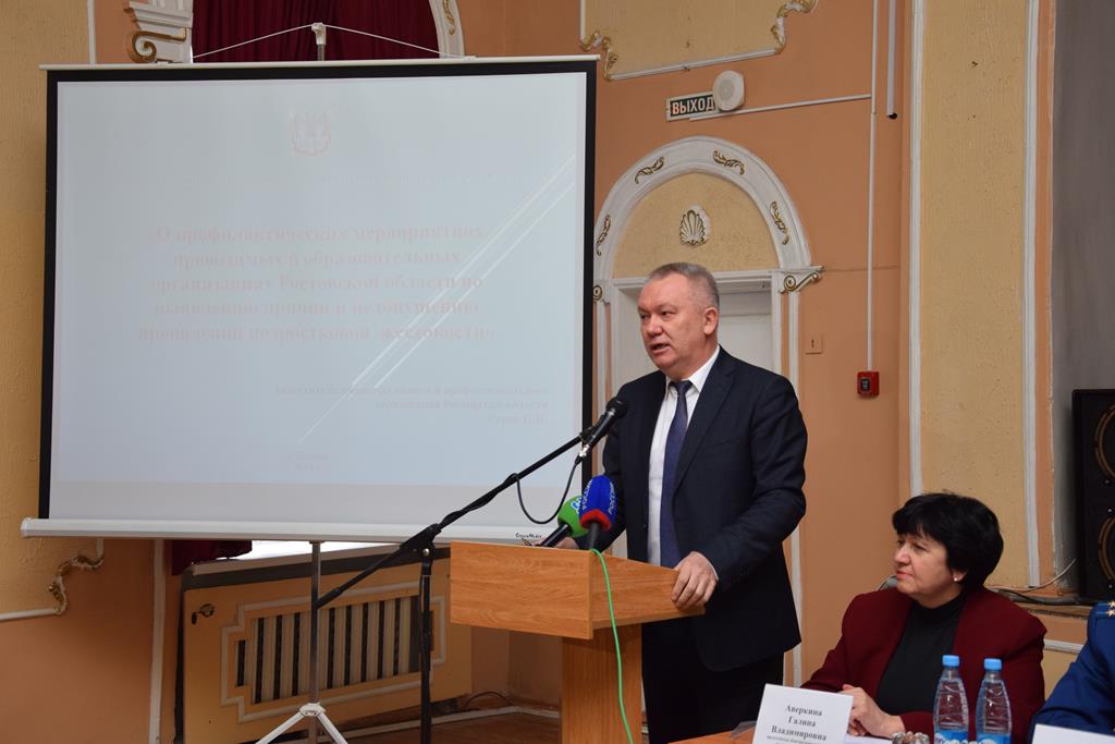 О профилактических мероприятиях, проводимых в образовательных учреждениях и направленных на устранение причин подростковой жестокости и негативных проявлениях среди учащихся, рассказал заместитель министра общего и профессионального образования Ростовской области П.Н. Серов. Предупреждение и профилактика жестокого поведения школьников в современном мире принимает не только социально значимый характер, но и психологический. Формирование безопасной среды учащихся – одно из особенных и основных заданий проведения коррекционных и профилактических действий по предупреждению насилия. К решению проблемы нужно подходить комплексно, в частности, использовать возможности вовлечения детей в конструктивные молодежные движения, в том числе добровольческие (волонтерские) отряды, а также патриотические объединения, регулярно осуществлять контроль социализации подростков и организации их досуга с целью ранней диагностики и коррекции проблем поведения.