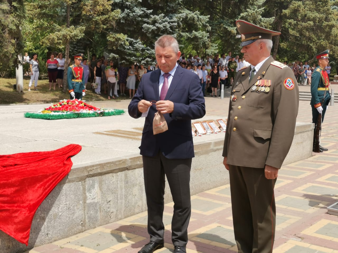 По установленному ритуалу, изъятыми с Братской могилы горстями земли наполнили «солдатский кисет». Затем его передали военному комиссару города.