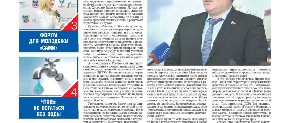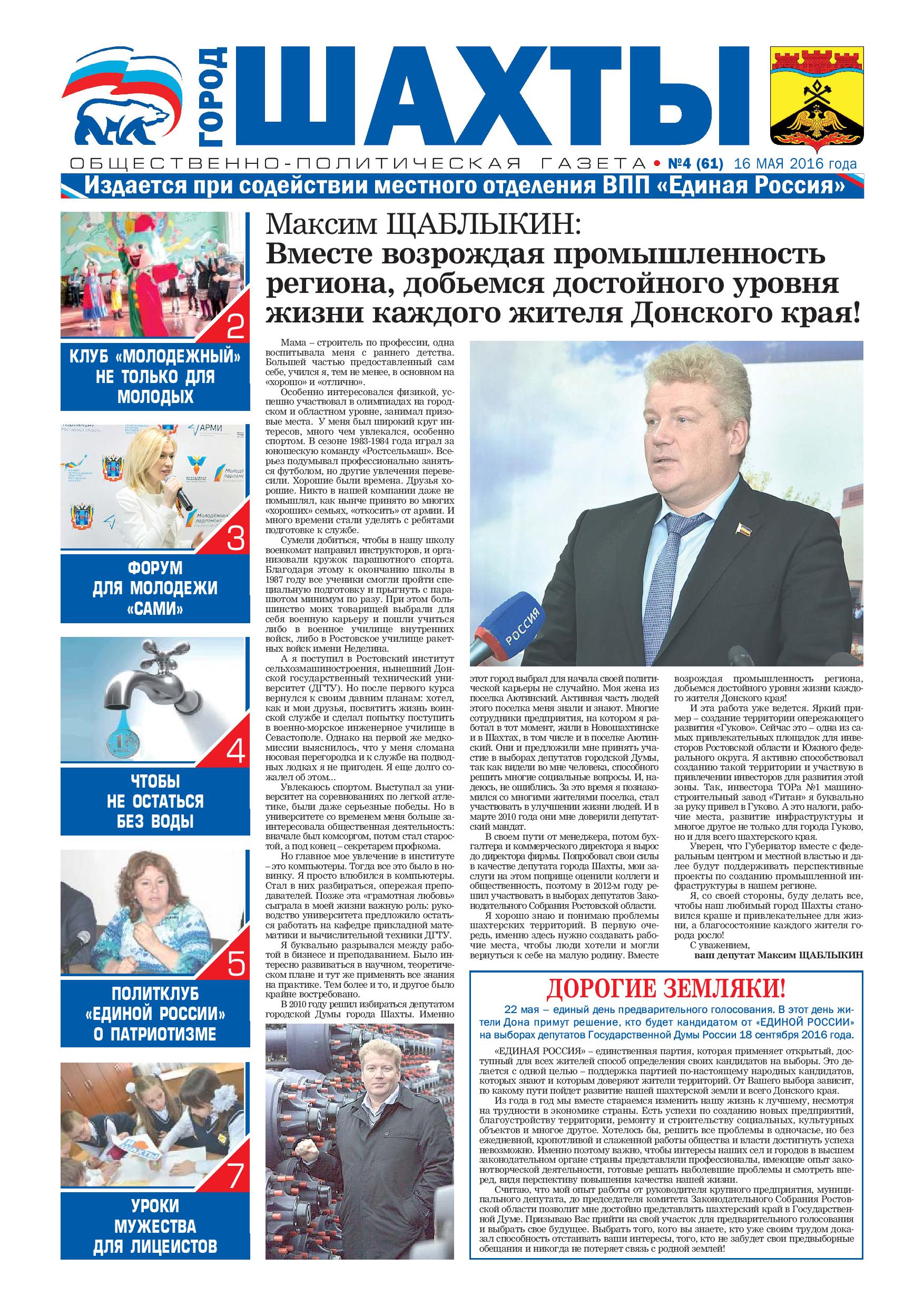 На страницах газеты — полная информация об участках предварительного голосования за кандидатов от партии «Единая Россия» в Государственную Думу РФ в городе Шахты. Голосование состоится 22 мая 2016 года! Также на страницах газеты — публикации о патриотическом воспитании молодёжи в городе, о новых достижениях шахтинских спортсменов, о гражданско-политическом форуме для молодёжи «САМИ», о деятельности на округе №6 депутата Дмитрия Приходько и многое другое. Читайте свежий номер газеты!