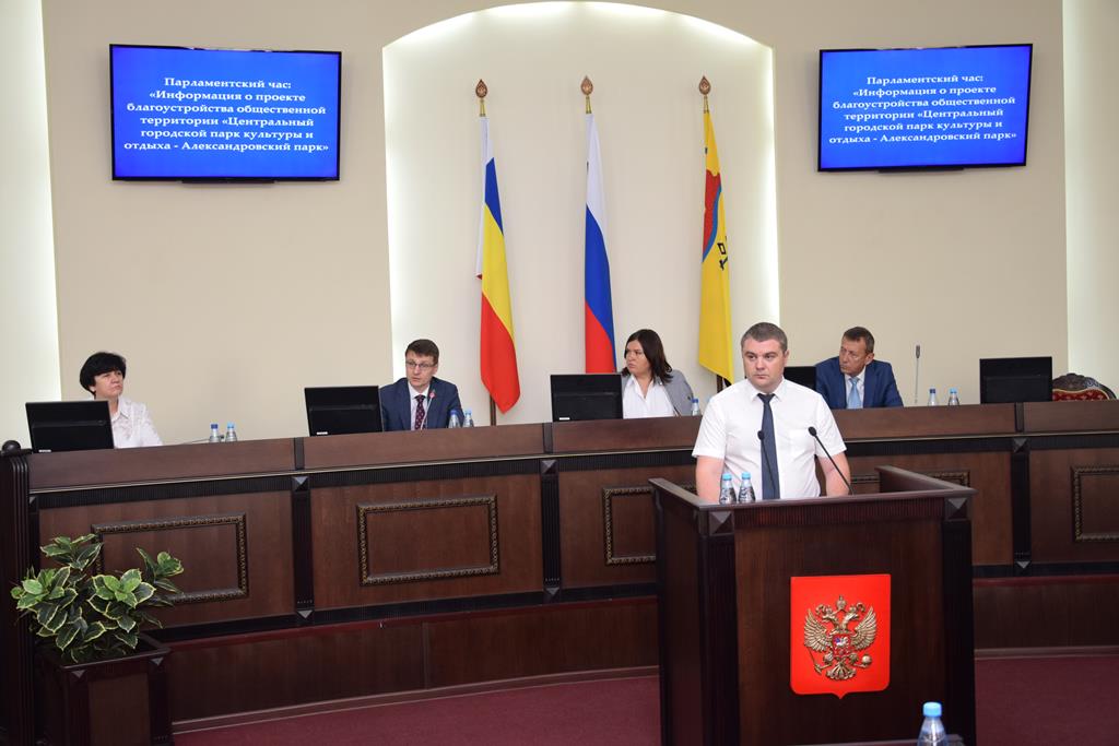В рамах «Парламентского часа» было заслушано два вопроса. Директор МКУ «Департамент городского хозяйства» г.Шахты О.В. Медведев представил депутатам информацию о проекте благоустройства общественной территории «Центральный городской парк культуры и отдыха — Александровский парк», а директор Департамента образования города Шахты Н.И. Соболева — информацию о подготовке детских дошкольных учреждений и школ города Шахты к 2019-2020 учебному году.