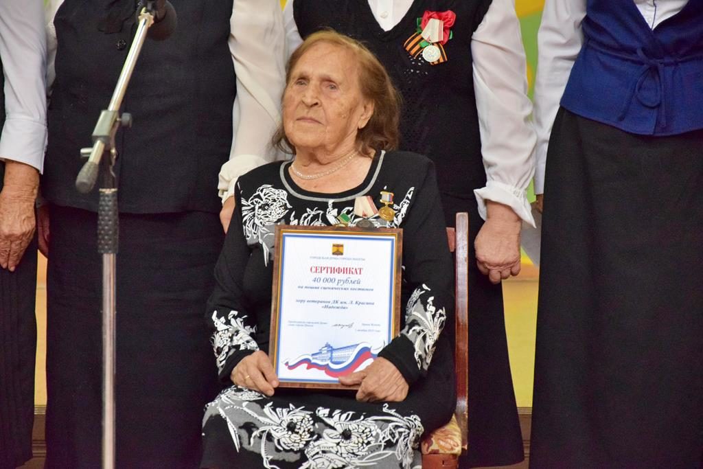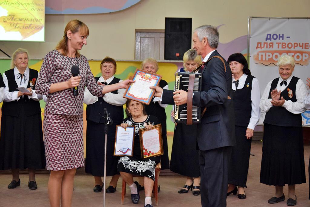 Так же сегодня исполнилось 15 лет хору ветеранов ДК им. Л. Красина «Надежда» и в связи с этим председатель городской Думы — глава города Шахты Ирина Жукова вручила хору сертификат на 40 000 рублей на пошив сценических костюмов и с поздравила всех присутствующих с осенним праздником Днем пожилого человека.
