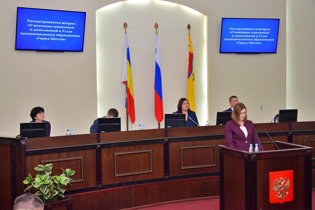 Первый вопрос о внесении изменений и дополнений в Устав муниципального образования «Город Шахты», докладчик управляющий делами городской Думы города Шахты А.Ю. Сафронова.
