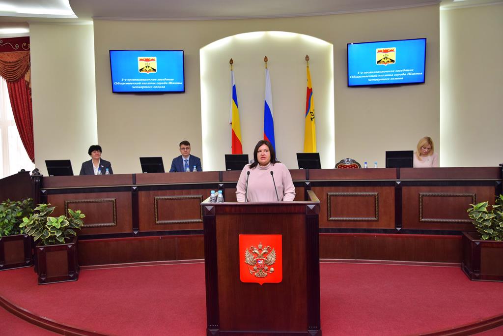 С приветственным словом к новому созыву Общественной палаты обратилась председатель городской Думы — глава города Ирина Анатольевна Жукова, она пожелала всем плодотворной работы на благо населения города, отметила ответственную и продуктивную работу членов трех предыдущих созывов палаты, рассказала об успешной практике сотрудничества между городской Думой и Общественной палатой. Также она вручила Благодарственные письма городской Думы за активную гражданскую позицию, большой личный вклад в общественную жизнь города, формирование атмосферы сотрудничества между органами местного самоуправления и городским сообществом Загорулько Юрию Васильевичу – председателю Общественной палаты города Шахты третьего созыва, Теплинскому Ивану Петровичу – заместителю Председателя Общественной палаты города Шахты третьего созыва, Жемойтелю Владимиру Викторовичу – председателю комиссии Общественной палаты города Шахты третьего созыва по развитию институтов гражданского общества, углублению демократизации общественной жизни и защите прав человека, Макарову Михаилу Витальевичу – председателю комиссии Общественной палаты города Шахты третьего созыва по экономическому развитию, строительству, бюджету и поддержке предпринимательства, Минкиной Тамаре Васильевне – председателю комиссии Общественной палаты города Шахты третьего созыва по здравоохранению, формированию здорового образа жизни и экологии, Севостьяновой Белле Анатольевне – члену Общественной палаты города Шахты третьего созыва