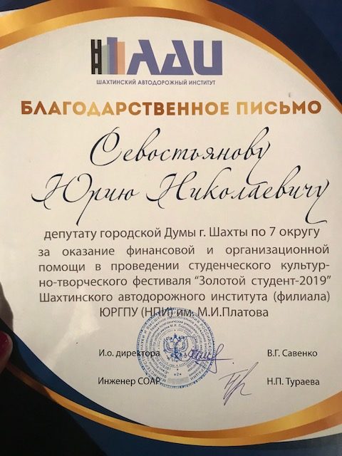Культурно-творческий фестиваль «Золотой студент-2019» Шахтинского автодорожного института,по праву являющийся знаковым событием в культурной жизни города, завершился большим гала-концертом победителей и лауреатов. Праздник молодых талантов,креатива,зажигательного веселья запомнится всем! Председатель Молодежного парламента города А.Д.Греков, начальник отдела по молодёжной политике Администрации города Я.Ю. Стуров, помощники депутата городской Думы Ю.Н.Севостьянова В.А.Новосёлов и К.Н.Чередниченко поздравили всех с Международным Днём студентов и триумфальным завершением фестиваля «Золотой студент-2019» и отметили Почётными грамотами организаторов и участников фестиваля. Традиционные призы-статуэтки «Золотого студента-2019″в десяти номинациях вручили победителям фестиваля помощники депутата Ю.Н.Севостьянова В.А.Новосёлов, К.Н.Чередниченко, активистка Совета округа №7 Н.С.Верещагина и руководитель сети студий восточного танца «Хадижа» С.Н.Мансурова. За оказание финансовой о организационной помощи в проведении фестиваля «Золотой студент-2019» ШАДИ (филиала) ЮРГПУ (НПИ) им.М.И.Платова депутат городской Думы города Шахты Ю.Н.Севостьянов отмечен Благодарственным письмом руководства института.