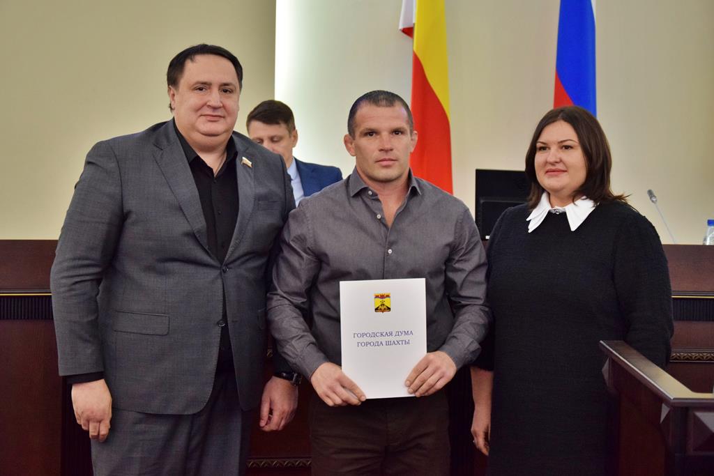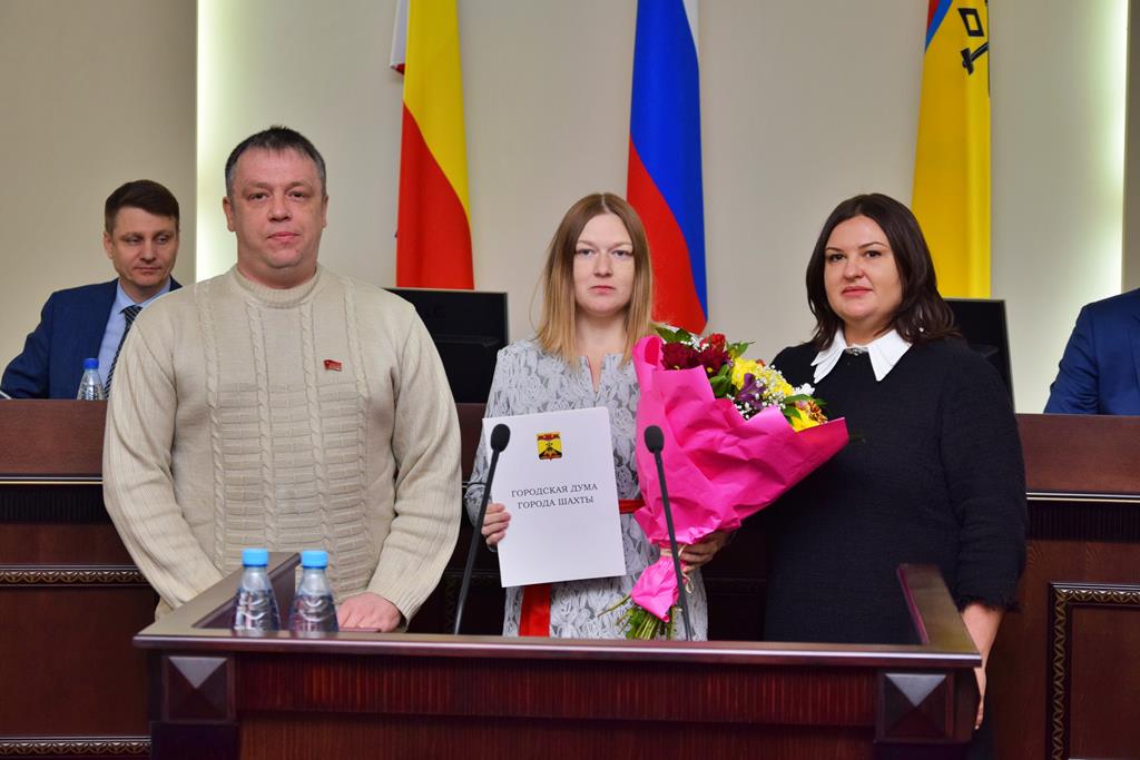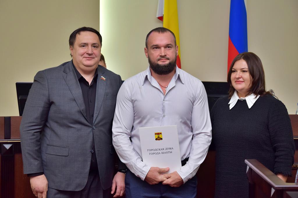 Председатель городской Думы — глава города Шахты И.А.Жукова вручила Почетные грамоты городской Думы аудитору Контрольно-счетной палаты Кирпичкову Ивану Сергеевичу, Архангельскому Александру Сергеевичу – серебряному призеру Чемпионата мира по вольной и греко-римской борьбе среди мастеров ковра – ветеранов, за верность спорту, популяризацию города Шахты на международной спортивной арене и пропаганду здорового образа жизни среди молодежи, Архангельскому Алексею Сергеевичу – серебряному призеру Чемпионата мира по вольной и греко-римской борьбе среди мастеров ковра – ветеранов, за верность спорту, популяризацию города Шахты на международной спортивной арене и пропаганду здорового образа жизни среди молодежи, Симакину Вячеславу Александровичу – помощнику депутата городской Думы города Шахты по одномандатному избирательному округу №21 Скорикова А.В., за многолетний добросовестный труд и активную общественную деятельность, ˗ Мироновой Ирине Анатольевне – многодетной матери, за укрепление института семьи, пропаганду семейных ценностей и традиций, сохранение культурного и духовного наследия, достойное воспитание детей, а также в связи с празднованием Дня матери.