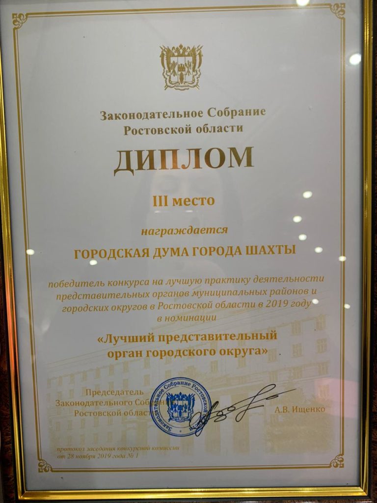 Городская Дума города Шахты заняла третье место в номинации «Лучший представительный орган городского округа».
