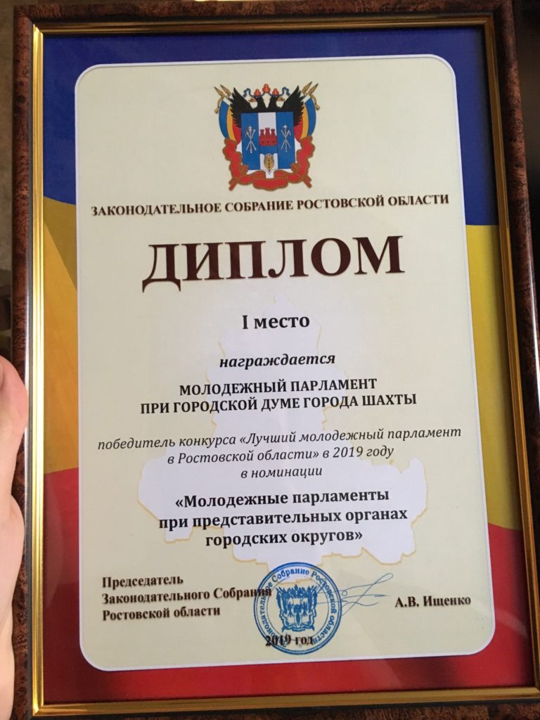 Молодежный парламент при городской Думе города Шахты стал победителем конкурса «Лучший молодежный парламент в Ростовской области» в 2019 году в номинации «Молодежные парламенты при представительных органах городских округов»
