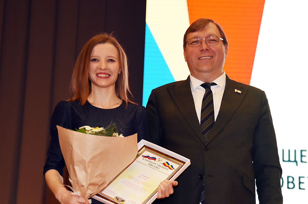 В ходе мероприятия были подведены итоги оценки эффективности деятельности органов местного самоуправления городских округов и муниципальных районов, а также вручены поощрения Губернатора Ростовской области, Законодательного Собрания и Общероссийского Конгресса муниципальных образований, в числе награжденных Благодарственным письмом Законодательного собрания Ростовской области заведующая контрольно-организационным сектором организационно-правового отдела Городской Думы города Шахты Дарья Стенякина, за значительный вклад в формирование и реализацию социально-экономической политики, активное участие в общественно-политическом развитии Ростовской области и добросовестный труд.