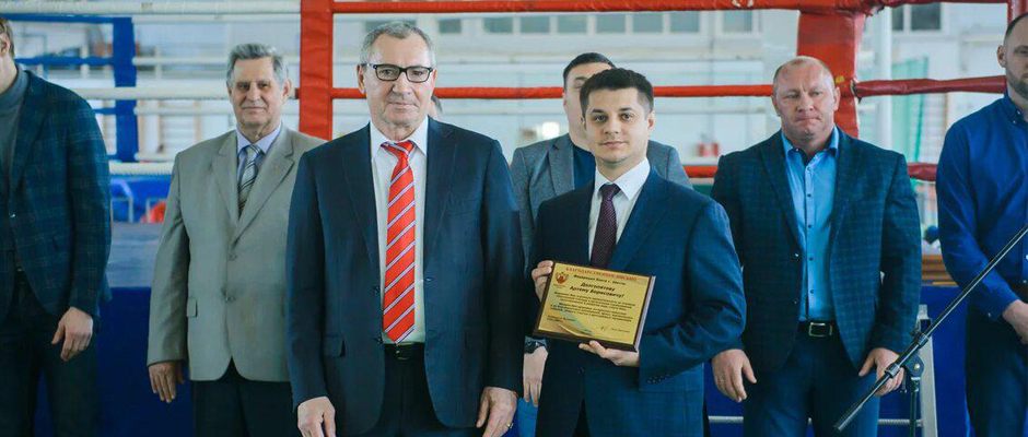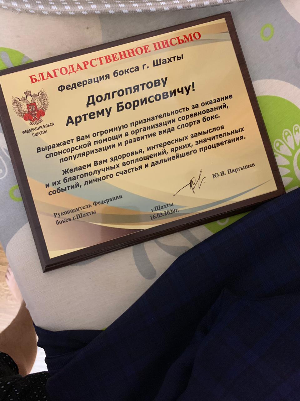 Руководитель Федерации бокса в г.Шахты Ю.И. Партышев вручил Благодарственное письмо Депутату городской Думы по избирательному округу №14 Долгопятову Артёму Борисовичу в котором выразил огромную благодарность за оказание спонсорской помощи в организации соревнований, популяризации и развитии вида спорта бокса.