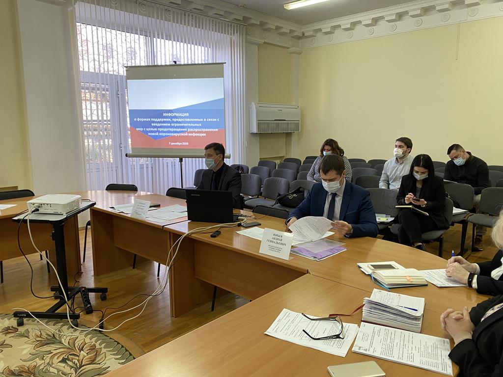 Первый вопрос информация о формах поддержки, предоставленных в связи с введением ограничительных мер с целью предотвращения распространения новой коронавирусной инфекции (COVID-19) и направленных на преодоление кризисных проявлений в экономике города Шахты, выступил директор Департамента экономики В.О. Горшков, а в качестве содокладчика председатель КУИ А.Г. Юрьев.