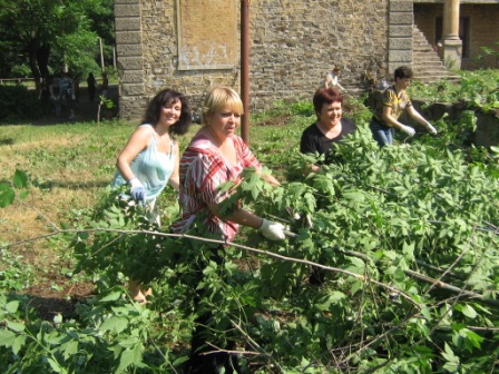 А в это время кипела работа на Майском. Работники ООО «Жилсервис» опиливали деревья на въезде в посёлок вдоль дороги, косили траву. Сотрудники департаментов Администрации усиленно мели дорожки около Дома культуры им.Чиха. Депутат А.В.Борзенко и депутат Т.В.Любушкина возглавили борьбу с зелёными зарослями с тыльной стороны Дома культуры, казалось, что нога человека здесь не ступала несколько лет! Тонны дикой поросли отправилось отсюда на свалку! А депутат Е.П.Стенякина придала событию праздничный вид и развесила вдоль центральной аллеи флаги «Единой России».