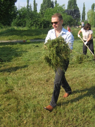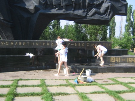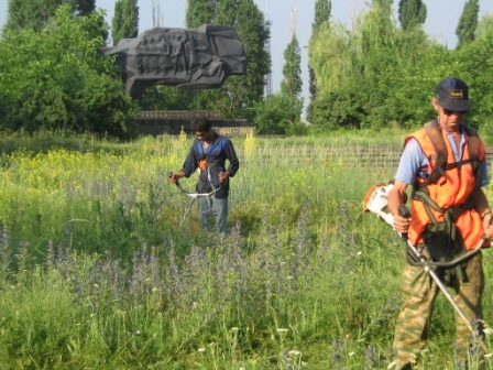 А на мемориале Славы раздавался шум косилок – за время июньских дождей здесь вымахали травяные заросли! Вслед за косарями траву сгребал с газонов весь аппарат Думы во главе с председателем Ириной Анатольевной Жуковой. Сюда же прибыли десятиклассники школы №49 с учителями и директором, члены «Молодой гвардии», депутат А.А.Рябов. Помощники депутата М.И.Щаблыкина организовали для участников субботника чай с бутербродами, подвезли питьевую воду. Установили музыкальные колонки и под песни Е.Ваенги работа пошла ещё веселее. Уже через несколько часов мемориал преобразился, принял парадный вид, сиял чистотой и ухоженностью.