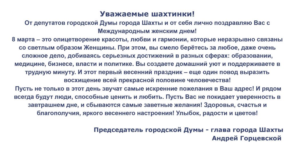 Поздравление председателя городской Думы — главы города Шахты Андрея Горцевского с Международным женским днем Размещено Мар 8, 2021 пользователем admin в В городской Думе Вконтакте