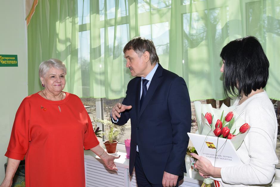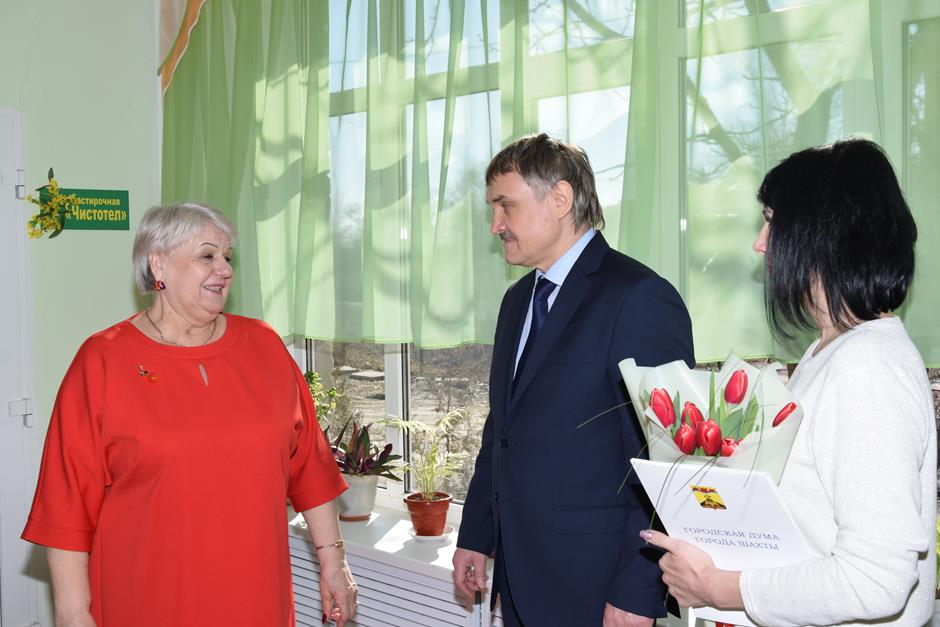 Среди награжденных в этот день Наталья Кильдюшова, руководитель структурного подразделения муниципального бюджетного общеобразовательного учреждения г.Шахты Ростовской области «Средняя общеобразовательная школа №35»: за многолетний труд в муниципальной системе образования, преданность педагогической профессии, а также в связи с празднованием Международного женского дня. В рамках визита в школу председатель городской Думы – глава города Шахты Андрей Горцевской обсудил ряд вопросов с директором учреждения Тамарой Кадыровой.