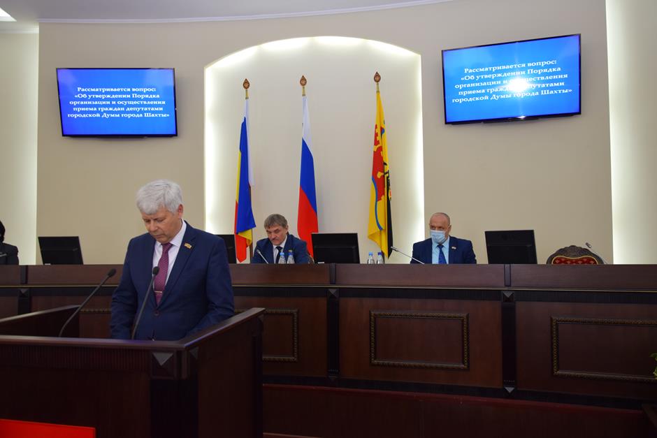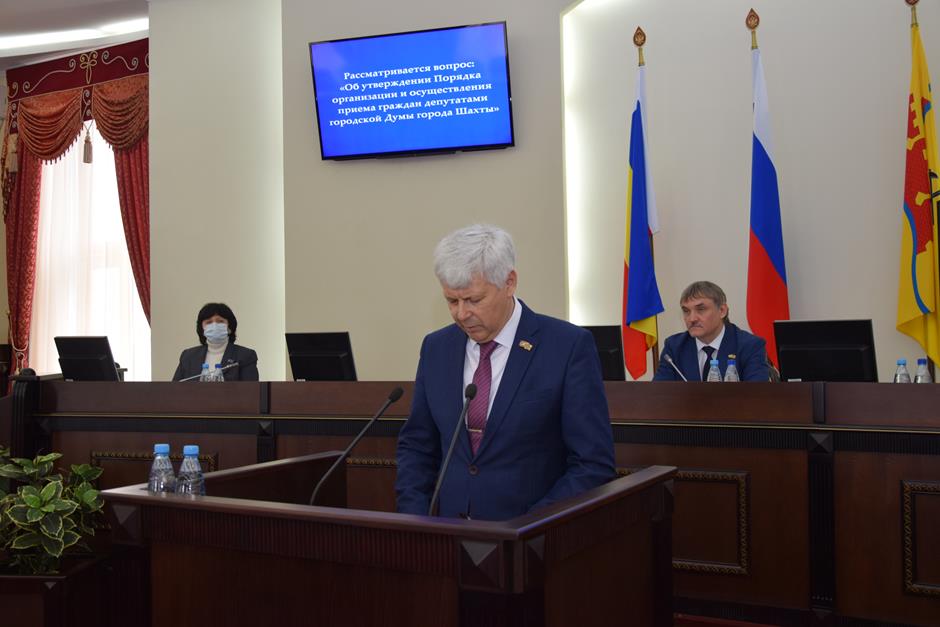 По 10-ому вопросу повестки «Об утверждении «Порядка организации и осуществления приема граждан депутатами городской Думы города Шахты» доложил председатель комитета по регламентным вопросам и депутатской этике Виктор Яровой. Порядок закрепляет обязанность депутата проводить личный прием граждан не реже 1 раза в месяц с продолжительностью не менее 1 часа, регламентирует способ доведения до сведений граждан графика приема депутата, а также внесение изменений в сформированный сводный график приема граждан. Также в представленном документе закреплены порядок действий депутата при поступлении устных и письменных обращений и обязанность депутатов ежемесячно направлять отчет о проведении приемов граждан в адрес городской Думы города Шахты.