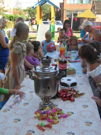 Этот многоквартирный дом отличается особой ухоженностью: по фасаду лепнина в виде гроздьев винограда, пышные клумбы с ярко-малиновыми гребнями целозии и цветами оранжево-жёлтого тагетиса, детская площадка с качелями, сказочным домиком. Вся эта красота возникла не в одночасье, но жители единогласны в том, что большая заслуга в этом принадлежит Ларисе Анатольевне Гатиловой, председателю ТСЖ. Эта удивительная женщина впервые ввела уличные чаепития за большим самоваром для всех жильцов дома, стала помогать готовить детям концерты, занялась обустройством детской площадки. А ещё она установила тёплые отношения с управляющей компанией, заинтересовала своими идеями, энтузиазмом депутата своего избирательного округа №20 Алексея Владимировича Тушминцева. В прошлом году Алексей Владимирович помогал обустраивать детскую площадку, а в этом приобрёл для малышей качели. По традиции, в преддверии нового учебного года дети подготовили замечательный концерт, с песнями и стихами выступили Анастасия Жаркова, Лиза Пашковская, Света Кузьмина, Лера Стефанова, Ксения и Анастасия Басовы, Даша Галичева, Анна Живова. Гости праздника аплодисментами встречали каждое выступление, депутат А.В.Тушминцев каждому артисту вручил подарок и для всех детей двора привёз гору конфет, торты.