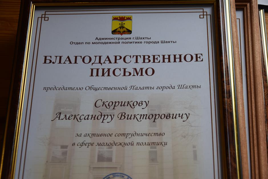 Председатель Общественной палаты города Шахты Александр Скориков поощрен за активное сотрудничество в сфере молодежной политики