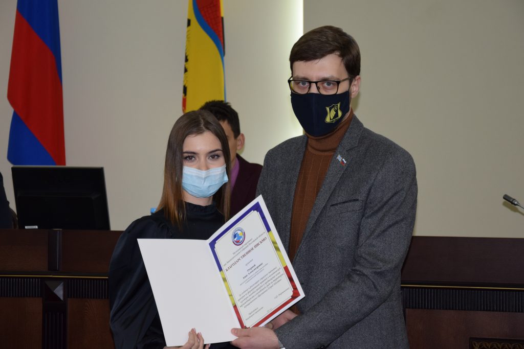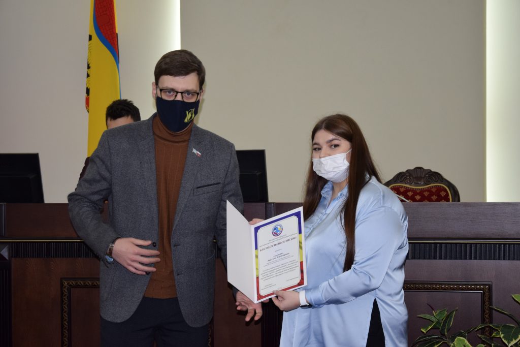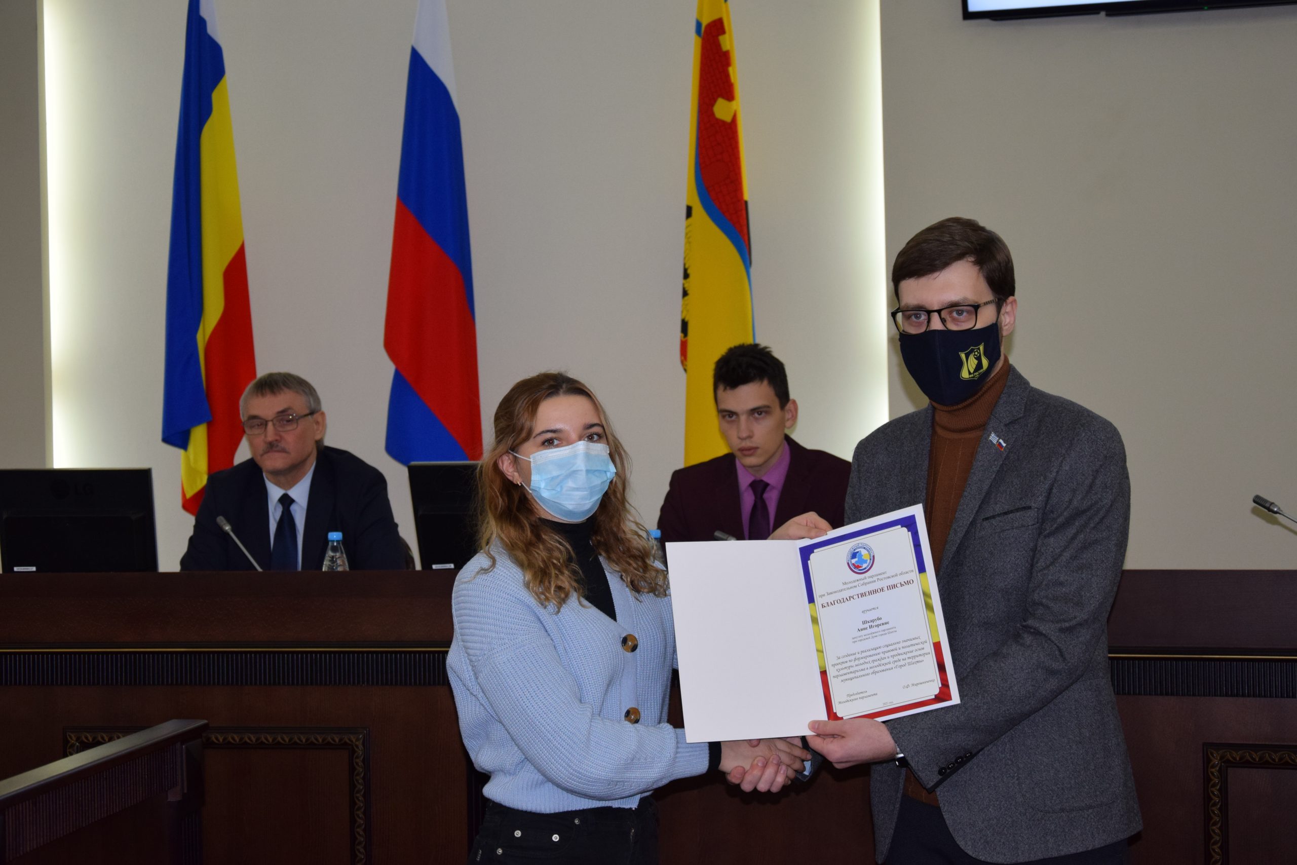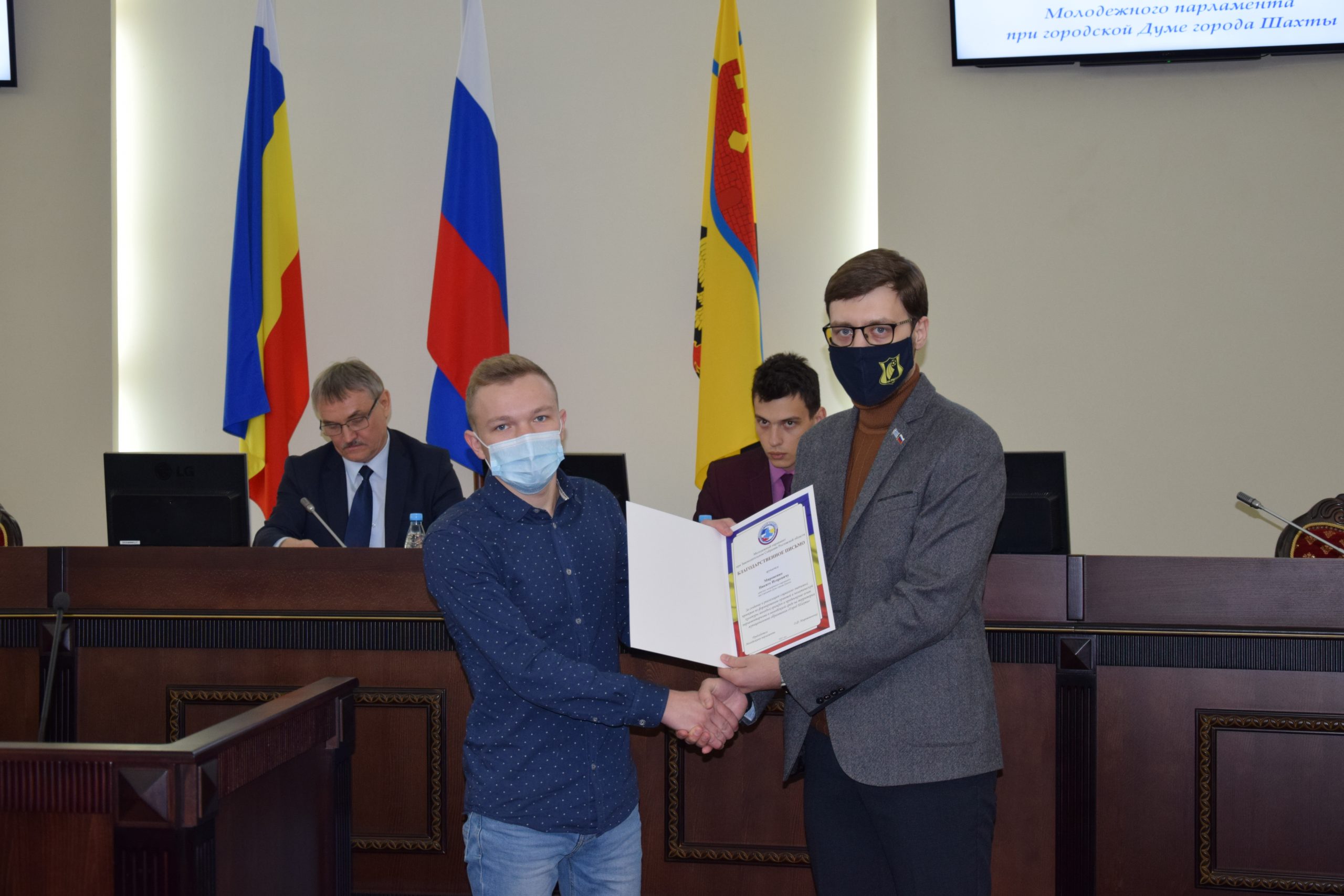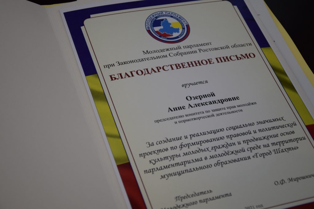 Анна Шкарубо, Анастасия Апанасевич, Анна Озерная — за создание и реализацию социально значимых проектов по формированию правовой и политической культуры молодых граждан и продвижение основ парламентаризма в молодёжной среде на территории муниципального образования «Город Шахты». Вручил Благодарственные письма Артем Греков –председатель комиссии по образованию, культуре и туризму Молодёжного парламента при ЗСРО.