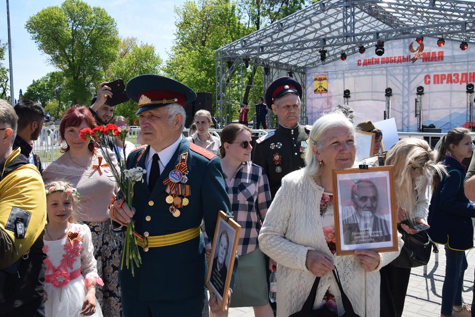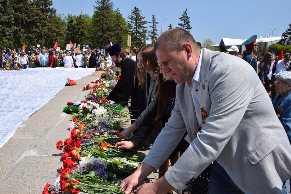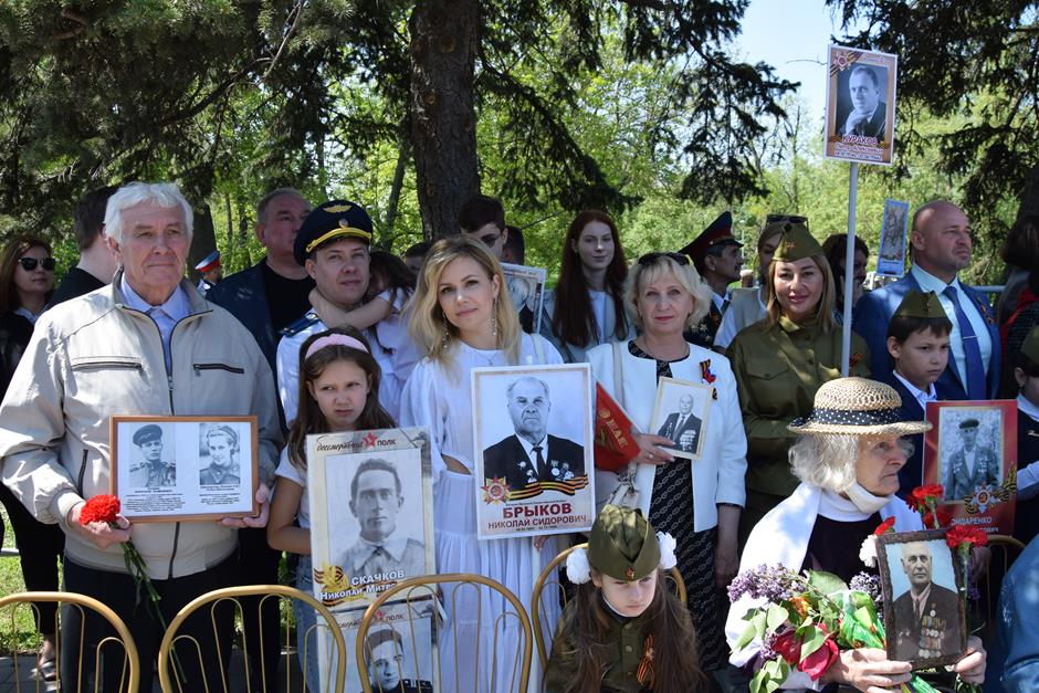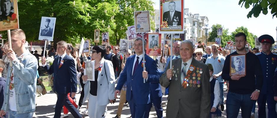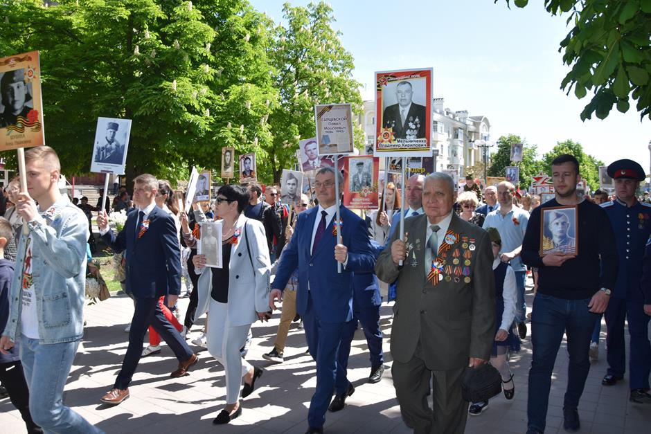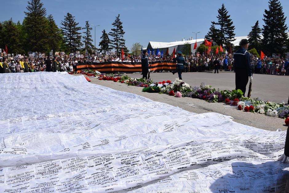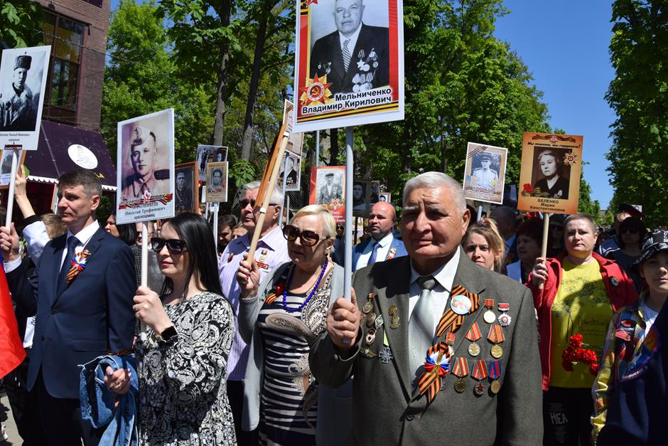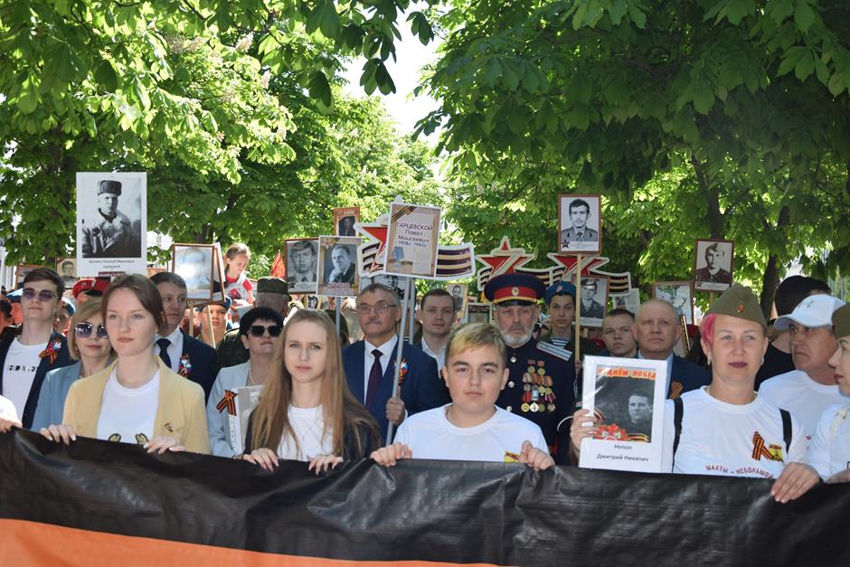 Традиционное возложение цветов состоялось также у памятника Солдату на площади 40-летия Победы. Многочисленные ряды «Бессмертного полка» в этом году прошли по улице Шевченко и центральной аллее Александровского парка. Направлял движение автомобиль с ветеранами Великой Отечественной войны. Завершилось шествие митингом у Вечного огня. Перед собравшимися выступили глава Администрации Андрей Ковалев, депутат ЗСРО Ирина Жукова (передавшая Совету ветеранов письма-поздравления детей Донбасса), председатель городской Думы – глава города Андрей Горцевской, военный комиссар по городу Шахты и Октябрьскому (с) району Иван Вансович. В этом году участникам патриотического мероприятия было представлено «Полотно памяти», созданное из 16 тысяч лоскутов с фамилиями не вернувшихся с полей сражений и пропавших без вести в годы Великой Отечественной войны шахтинцев. Память погибших героев почтили минутой молчания. К братской могиле возложили венки и цветы.