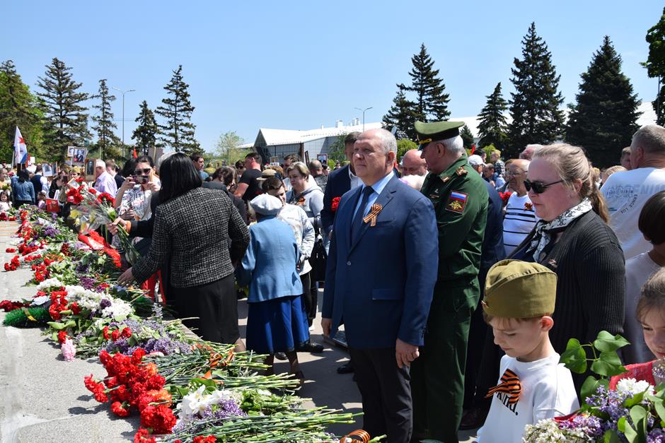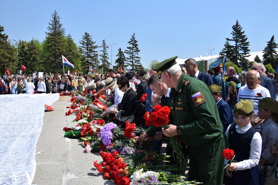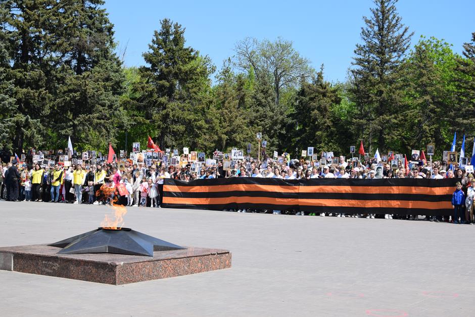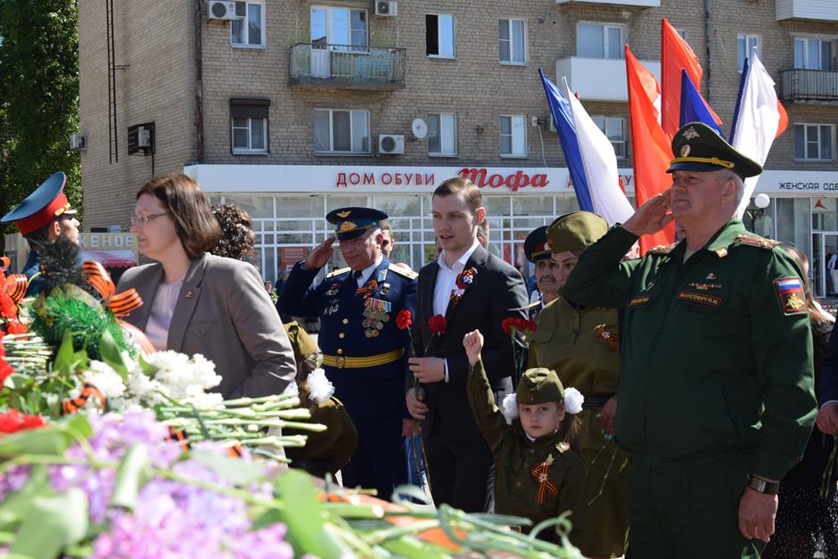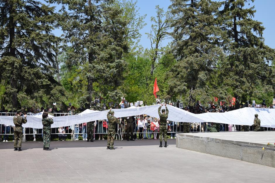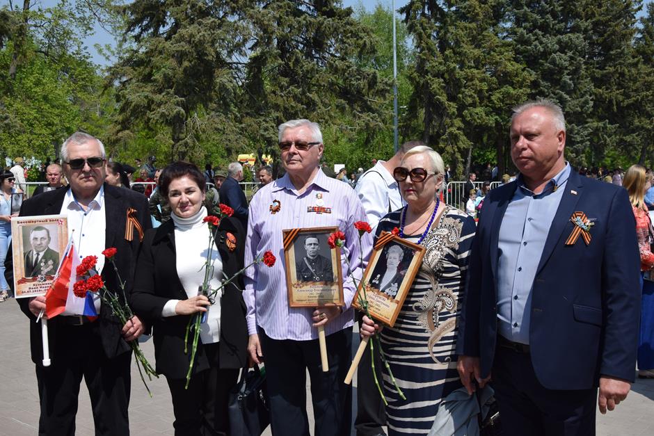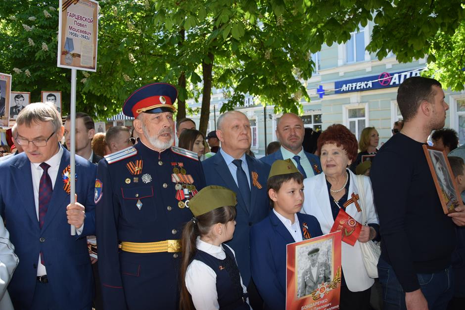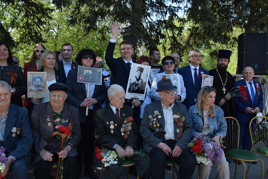 Традиционное возложение цветов состоялось также у памятника Солдату на площади 40-летия Победы. Многочисленные ряды «Бессмертного полка» в этом году прошли по улице Шевченко и центральной аллее Александровского парка. Направлял движение автомобиль с ветеранами Великой Отечественной войны. Завершилось шествие митингом у Вечного огня. Перед собравшимися выступили глава Администрации Андрей Ковалев, депутат ЗСРО Ирина Жукова (передавшая Совету ветеранов письма-поздравления детей Донбасса), председатель городской Думы – глава города Андрей Горцевской, военный комиссар по городу Шахты и Октябрьскому (с) району Иван Вансович. В этом году участникам патриотического мероприятия было представлено «Полотно памяти», созданное из 16 тысяч лоскутов с фамилиями не вернувшихся с полей сражений и пропавших без вести в годы Великой Отечественной войны шахтинцев. Память погибших героев почтили минутой молчания. К братской могиле возложили венки и цветы.