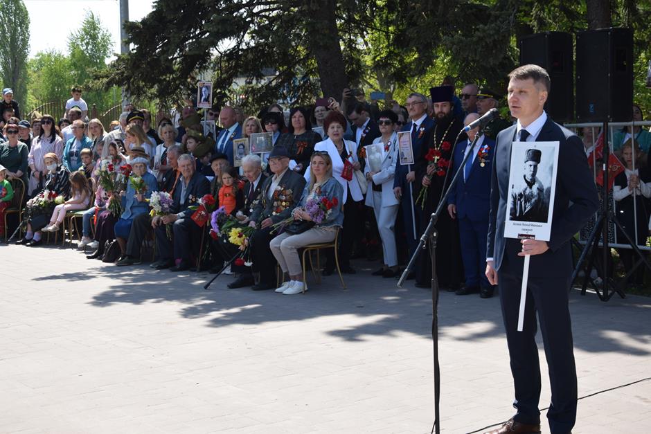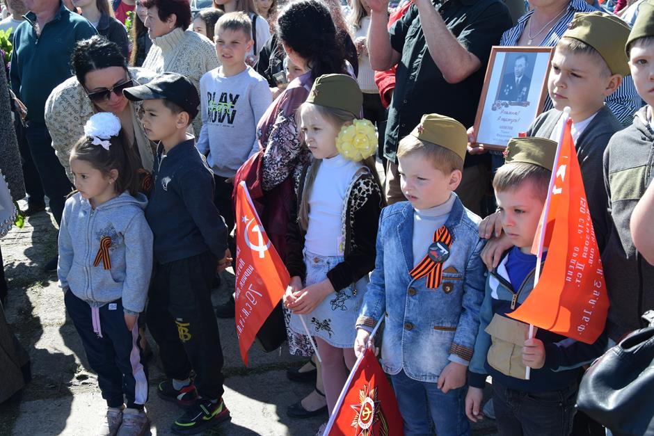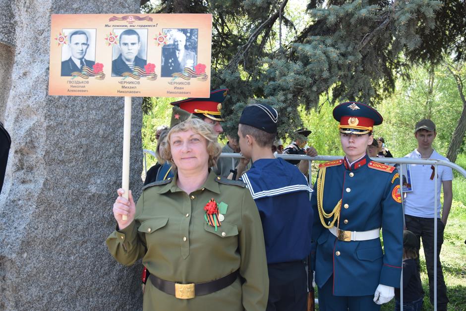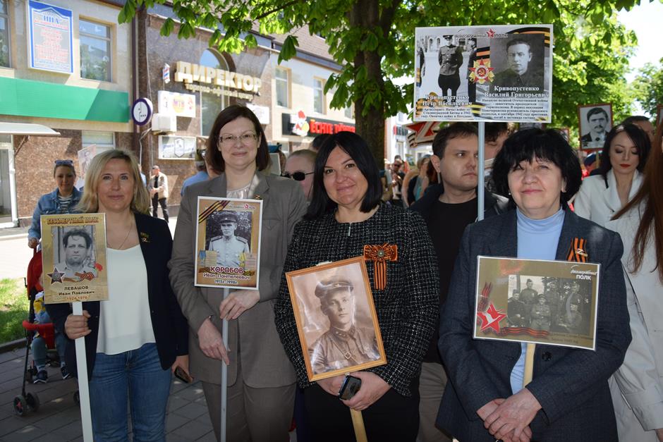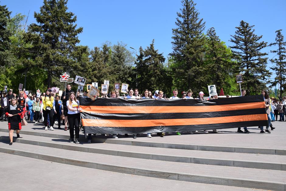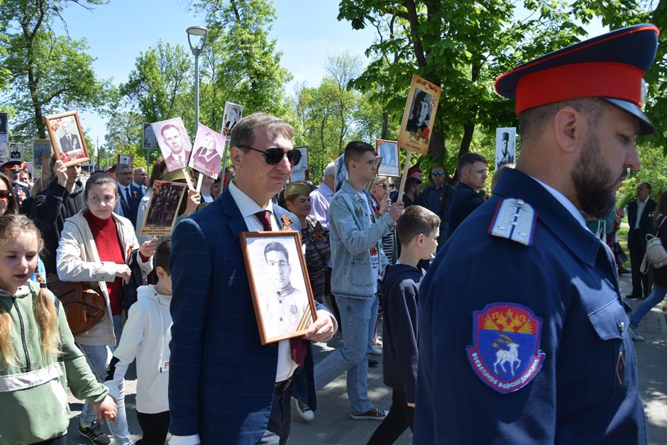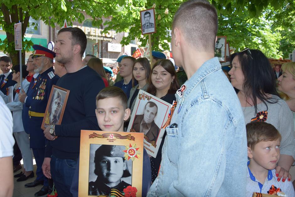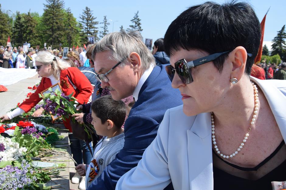 Традиционное возложение цветов состоялось также у памятника Солдату на площади 40-летия Победы. Многочисленные ряды «Бессмертного полка» в этом году прошли по улице Шевченко и центральной аллее Александровского парка. Направлял движение автомобиль с ветеранами Великой Отечественной войны. Завершилось шествие митингом у Вечного огня. Перед собравшимися выступили глава Администрации Андрей Ковалев, депутат ЗСРО Ирина Жукова (передавшая Совету ветеранов письма-поздравления детей Донбасса), председатель городской Думы – глава города Андрей Горцевской, военный комиссар по городу Шахты и Октябрьскому (с) району Иван Вансович. В этом году участникам патриотического мероприятия было представлено «Полотно памяти», созданное из 16 тысяч лоскутов с фамилиями не вернувшихся с полей сражений и пропавших без вести в годы Великой Отечественной войны шахтинцев. Память погибших героев почтили минутой молчания. К братской могиле возложили венки и цветы.