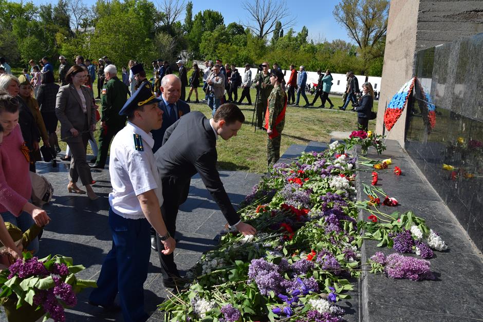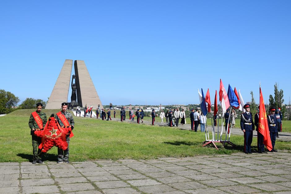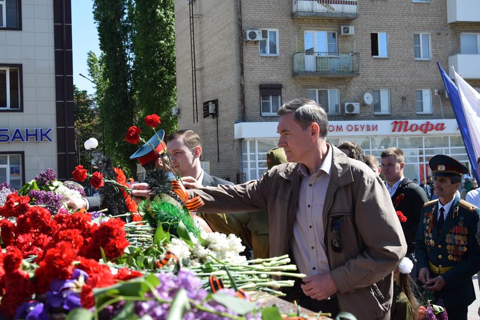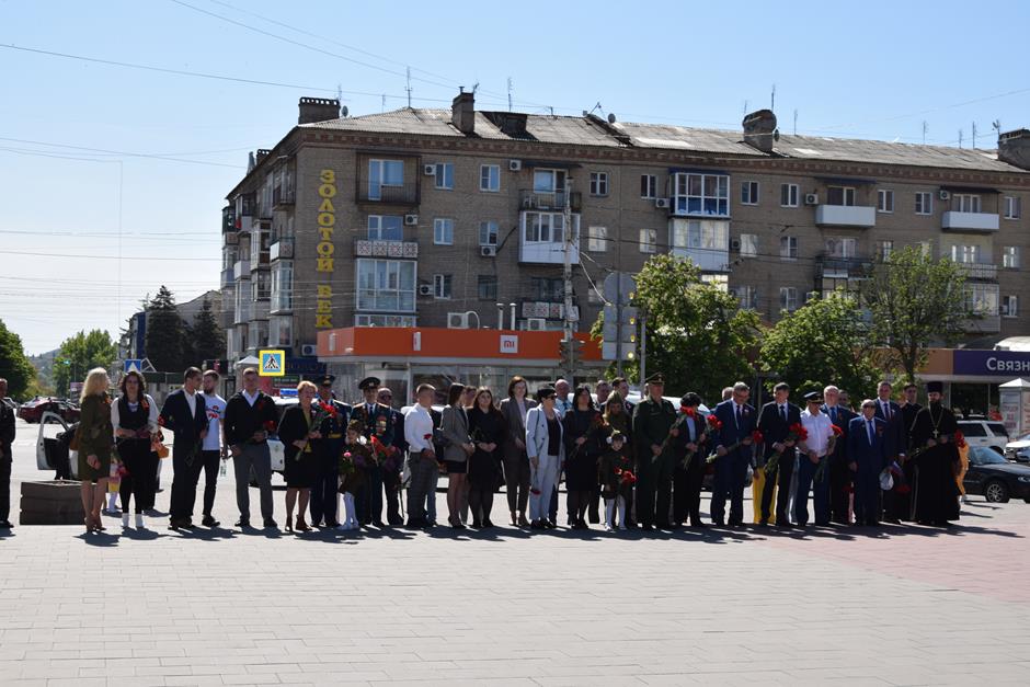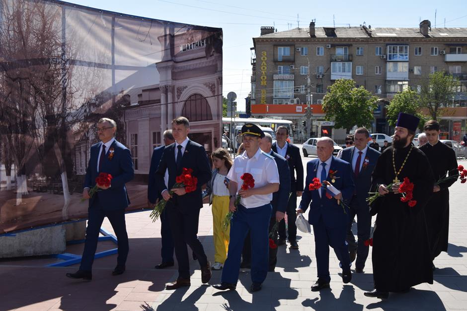 Ранним утром 9 Мая шахтинцы собрались на территории комплекса «Жертвам фашизма» на Красина. Здесь в годы гитлеровской оккупации были сброшены в шурф шахты 3500 тысячи человек, в том числе дети и старики.