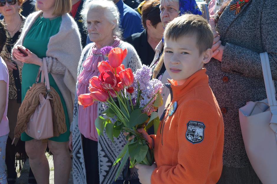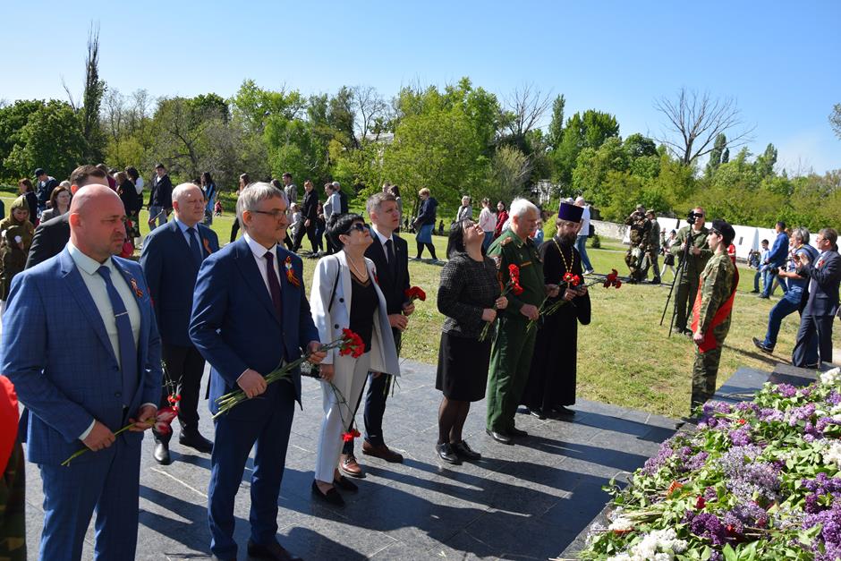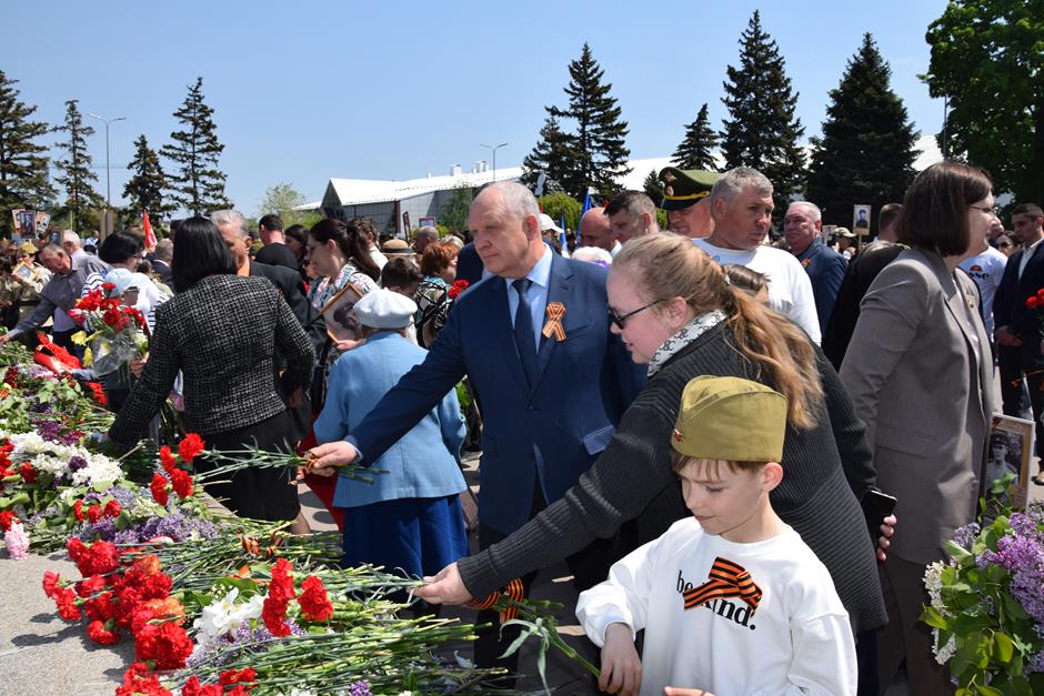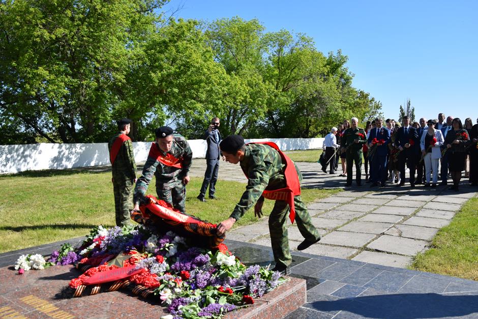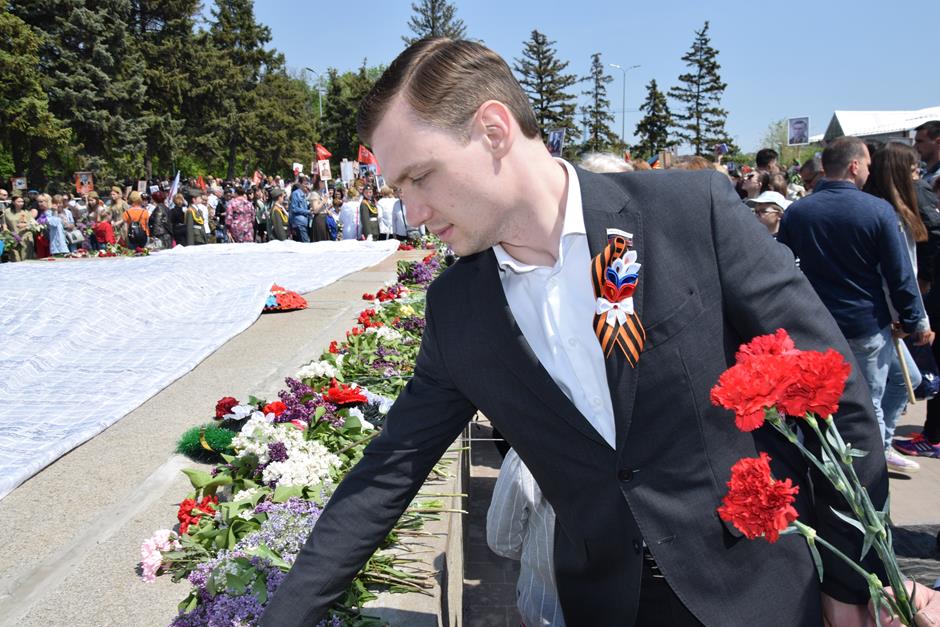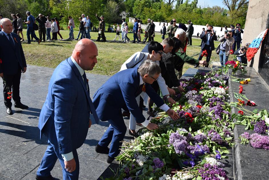 Ранним утром 9 Мая шахтинцы собрались на территории комплекса «Жертвам фашизма» на Красина. Здесь в годы гитлеровской оккупации были сброшены в шурф шахты 3500 тысячи человек, в том числе дети и старики.