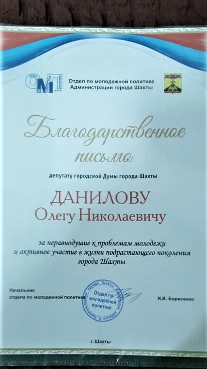 10 молодых волонтеров отмечены Благодарственными письмами Молодежного парламента при городской Думе города Шахты, поощрения вручила председатель Молодежного парламента Анастасия Апанасевич. Юных спортсменов за успехи наградил директор Департамента спорта и физического развития Валентин Стрелков. За активное участие в жизни подрастающего поколения Благодарственного письма отдела по молодежной политике удостоен депутат, председатель комитета городской Думы по местному самоуправлению и молодежной политике Олег Данилов.