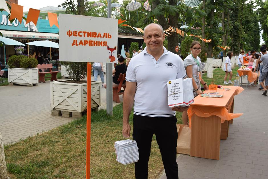 Празднование Дня молодежи в Шахтах состоялось на территории Александровского парка, где развернулись несколько площадок. Они открылись одновременно в 17 часов. «Фестиваль дарения» был организован в городе впервые. Депутатский корпус города Шахты поддержал «круговорот добра», представив в этом проекте молодежь с особенностями развития общественной организации «Финист». Благодаря чему горожане получили возможность прикоснуться к творчеству и таланту ребят с ОВЗ, получив частичку их души в виде сувенира.