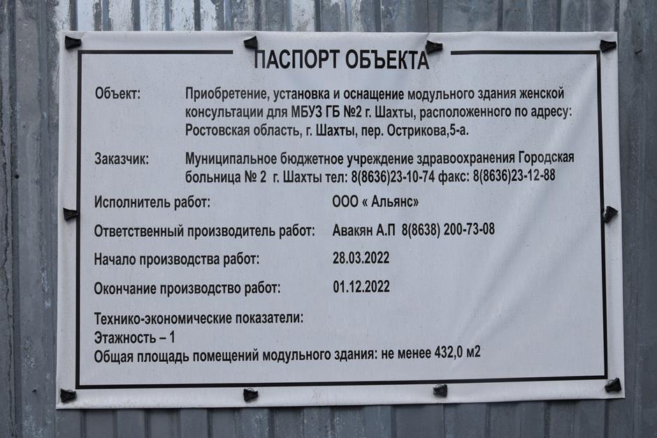 Модульное здание женской консультации для МБУЗ ГБ№2 возводится с марта 2022 года по Острикова, 5А.Окончание работ намечено на 1 декабря. Подрядчик – ООО «Альянс» — трудится с опережением сроков, сообщил главный врач больницы Михаил Горловецкий, рассказавший о планировке и функциональном назначении помещений. Всего здесь будут расположены 15 кабинетов, в том числе кабинет УЗИ и комнаты для приема пациенток. Председатель городской Думы – глава города Шахты Андрей Горцевской обратил внимание на необходимость организации в модульном здании естественной вытяжки воздуха, чтобы медперсоналу и посетителям в нем было комфортно. 11 кондиционеров, которые установят по периметру, для обеспечения должного уровня вентиляции будет недостаточно, — подчеркнул Андрей Горцевской. Замечание представителем ООО «Альянс» учтено. Следующий визит в рамках «депутатского и общественного контроля» на данном объекте состоится через месяц – в начале сентября.