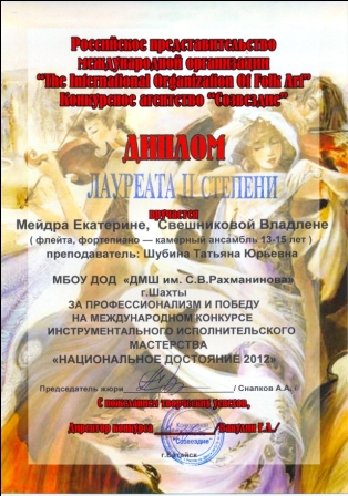 Ученицы детской музыкальной школы им.С.В.Рахманинова Екатерина Мейдра и Владлена Свешникова завоевали звание лауреатов 2 степени на международном конкурсе инструментального исполнительского мастерства «Национальное достояние 2012».