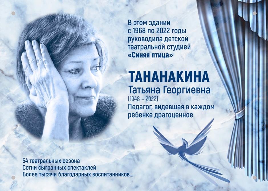 Она видела в каждом ребенке драгоценное… Вся трудовая биография почетного работника образования Российской Федерации Татьяны Тананакиной с 1968 года была связана с дополнительным образованием и детской театральной деятельностью в городе Шахты. С ходатайством об увековечивании памяти педагога в городскую Думу обратился коллектив ГДДТ совместно с родительской общественностью и выпускниками студии «Синяя птица», которой руководила Татьяна Тананакина. В 2008 году ее имя было внесено в Энциклопедию «Лучшие люди России» в приложение «Одаренные дети – будущее России».