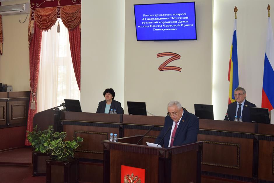 Вопросом №18 депутаты согласовали награждение Почетной грамотой городской Думы коллектива ГБОУ Ростовской области «Шахтинский генерала Я.П. Бакланова казачий кадетский корпус» – за патриотическое воспитание, сохранение традиций, несение воинской службы донским казачеством, образцовое исполнение служебных обязанностей и достигнутые успехи в работе и в связи с 20-летним юбилеем со дня образования кадетского корпуса. Такой же награды будет удостоена заместитель директора учреждения по учебно-воспитательной Чертова Ирина Геннадьевна – за значительные заслуги в сфере образования, воспитания детей и молодежи, многолетний добросовестный труд и в связи с 20-летием со дня образования кадетского корпуса (вопрос №19).