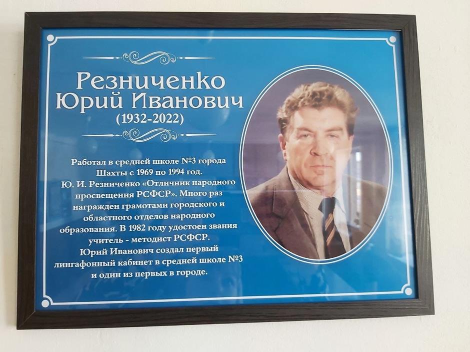 К торжественному дню приурочили ещё одно знаменательное и необычное событие. Кабинету английского языка было присвоено имя Юрия Ивановича Резниченко — отличника народного просвещения РСФСР, учителя-методиста РСФСР, отдавшего школе N3 четверть века труда и души, создавшего здесь в своё время один из первых в Шахтах лингафонных кабинетов.