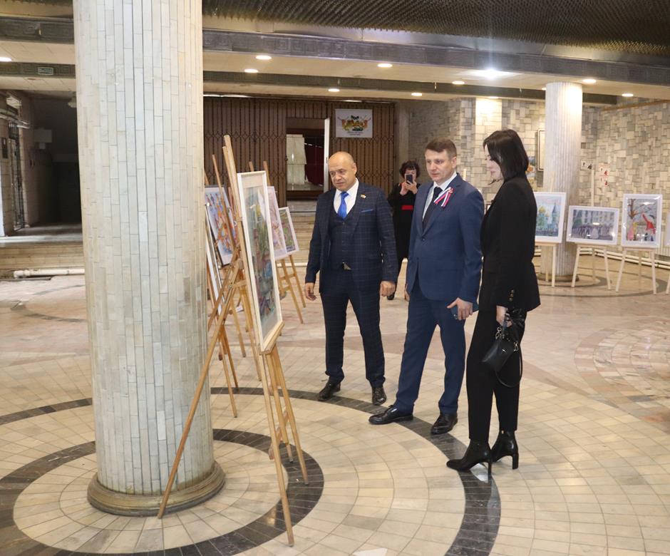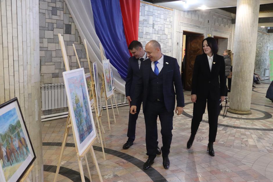 Гостей праздника встречали волонтеры, и перед началом официальной программы радовали и восхищали своим творчеством юные таланты — в фойе ГДК была организована выставка работ воспитанников Школы искусств.